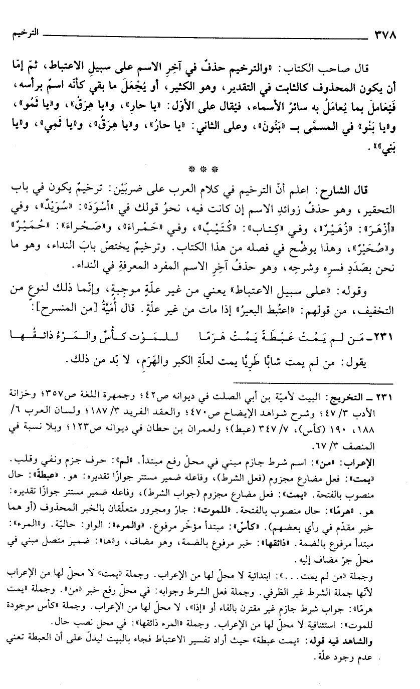 قال صاحب الكتاب: "والترخيم حذف في آخر الاسم على سبيل الاعتباط, ثم إما أن يكون المحذوف كالثابت في التقدير, وهو الكثير، أو يجعل ما بقي كأنه اسم برأسه, فيعامل بما يُعامل به سائر الأسماء, فيقال على الأول: "يا حار"، و"يا هرق"، و"يا ثمو"، و"يا بنو" في المسمى بـ "بنون", وعلى الثاني:"يا حار"، و"يا هرق", و"يا ثمى"، و"يا بني"".