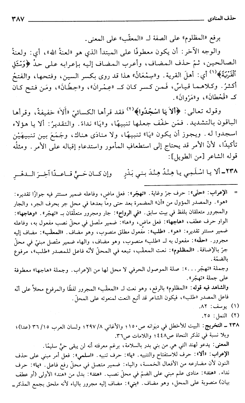 = الإعراب: "حتّى": حرف جرّ وغاية. "تهجّر": فعل ماضٍ، وفاعله ضمير مستتر فيه جوازًا تقديره: "هو". والمصدر المؤول من "أن" المضمرة بعد حتى وما بعدها في محل جر بحرف الجر، والجار والمجرور متعلقان بلفظ في بيت سابق. "في الرواح": جار ومجرور متعلّقان بـ "تهجّر". "وهاجها": الواو حرف عطف، "هاجها": فعل ماضٍ، و"ها": ضمير متّصل في محلّ نصب مفعول به، وفاعله ضمير مستتر تقديره: "هو". "طلب": مفعول مطلق منصوب، وهو مضاف. "المعقّب": مضاف إليه مجرور. "حقّه": مفعول به لـ "طلب" منصوب، وهو مضاف، والهاء ضمير متّصل مبنيّ في محلّ جرّ بالإضافة. "المظلوم": نعت المعقّب، تبعه في المحل لأنّه فاعل للمصدر "طلب"، مرفوع بالضمّة.