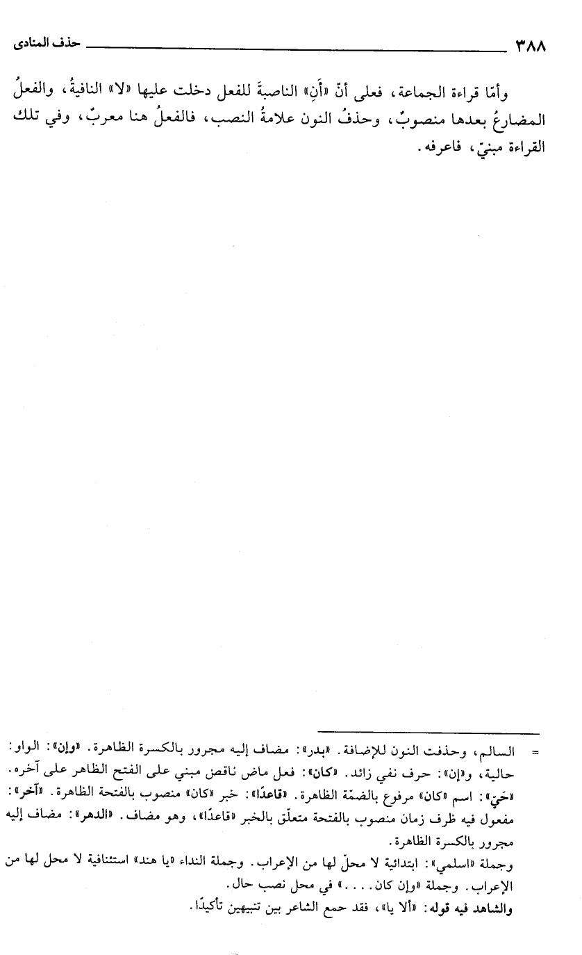 = السالم، وحذفت النون للإضافة. "بدر": مضاف إليه مجرور بالكسرة الظاهرة. "وإن": الواو: حالية، و"إن": حرف نفي زائد. "كان": فعل ماض ناقص مبني على الفتح الظاهر على آخره. "حَيّ": اسم "كان" مرفوع بالضمّة الظاهرة. "قاعدًا": خبر "كان" منصوب بالفتحة الظاهرة. "آخر": مفعول فيه ظرف زمان منصوب بالفتحة متعلّق بالخبر "قاعدًا"، وهو مضاف. "الدهر": مضاف إليه مجرور بالكسرة الظاهرة.