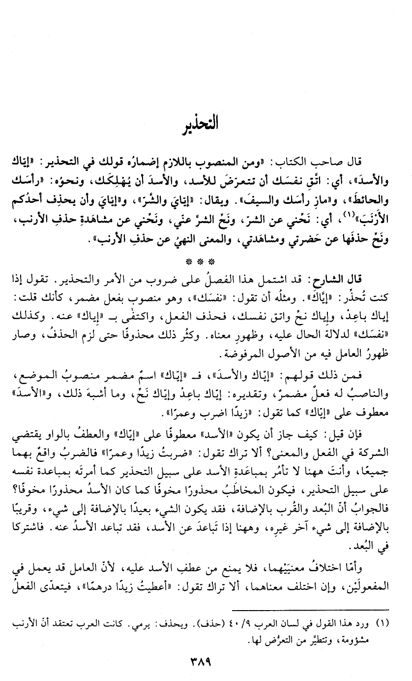 قال صاحب الكتاب: "ومن المنصوب باللازم إضماره قولك في التحذير: "إياك والأسد"، أي إتق نفسك أن تتعرض للأسد, والأسد أن يهلكك, ونحوه: "رأسك والحائط"، و"ماز رأسك والسيف". ويقال "إياي والشر"، و"إياي وأن يحذف أحدكم الأرنب" (¬1)، أي: نحني عن الشر، ونحّ الشر عني، ونحني عن مشاهدة حذف الأرنب، ونح حذفها عن حضرتي ومشاهدتي، والمعنى النهي عن حذف الأرنب".