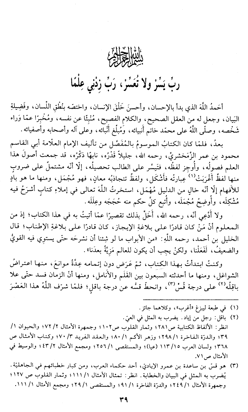 أحَمدُ الله الذي بدأ بالإحسان" وأحسنَ خَلْقَ الإنسان، واختصّه بنُطْقِ اللّسان، وفَضِيلةِ البَيان، وجعل له من العقل الصحيح، والكلامِ الفصيح، مُنْبِئًا عن نفسه، ومُخْبِرًا عمّا وَراء شَخْصه، وصلى اللهُ على محمّد خاتم أَنبيائه، ومُبلِّغ أَنْبائه، وعلى آله وأصحابه وأصفيائه. بعدُ، فلمّا كان الكتابُ الموسومُ بالمُفَصَّل من تأليف الإِمام العلامة أبي القاسم محمود بن عمر الزمَخشريِّ، رحمه الله، جليلاً قَدْرُه، نابهًا ذكْرُه، قد جمعت أصولَ هذا العلم فصولُه، وأُوجِز لفظُه، فتَيسَّر على الطالب تحصيلُه، إلاَّ أنّه مشتملٌ على ضروب منها لفظٌ أَغْرَبَتْ (¬1) عِبارتُه فأَشْكَل، ولفظٌ تتجاذبُه معانٍ، فهو مُجْمَل، ومنها ما هو بادٍ للأَفهام إلاَّ أنه خالٍ من الدليل مُهْمَل، استخرتُ الله تعالى في إملاءِ كتاب أشرَحُ فيه مُشْكِلَه، وأُوضِحُ مُجْمَلَه، وأُتبع كلَّ حكم منه حُجَجَه وعِلَلَه.