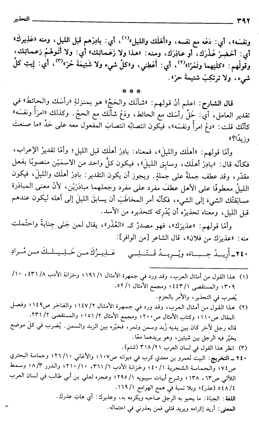 ونفسه" أي: دعه مع نفسه, و"أهلك والليل" (¬1)، أي بادرهم قبل الليل. ومنه "عذيرك" أي: أحضر عذرك أو عاذرك, ومنه: "هذا ولا زعماتك"أي: ولا أتوهم زعامتك, وقولهم: "كليهما وتمرًا" (¬2) , أي إعطني, و"كل شيء ولا شتيمة حر" (¬3) ,أي: إيت كل شيء, ولا ترتكب شيتمة حر".