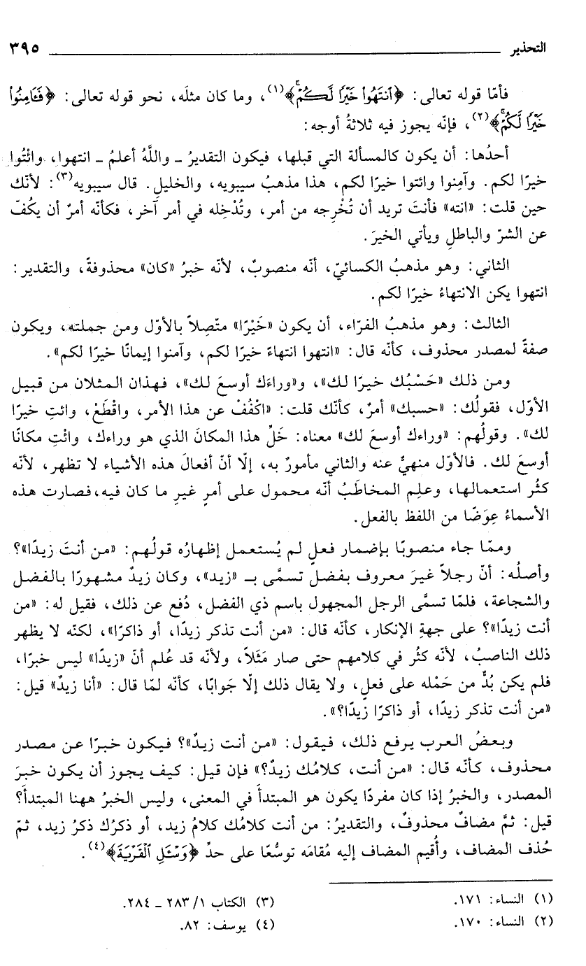الثالث: وهو مذهبُ الفرّاء، أن يكون "خَيْرًا" متّصِلًا بالأول ومن جملته، ويكون صفة لمصدر محذوف، كأنّه قال: "انتهوا انتهاءً خيرًا لكم، وآمنوا إيمانًا خيرًا لكم".