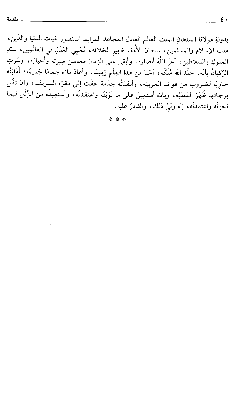 بدولةِ مولانا السلطانِ الملك العالم العادل المجاهد المرابط المنصور غياث الدنيا والدِّين، ملكِ الإِسلام والمسلمين، سلطانِ الأُمّة، ظهيرِ الخلافة، مُحْيِي العَدْلِ في العالَمِين، سيّدِ الملوكِ والسلاطين، أعزّ الله أنصارَه، وأبقى على الزمان محاسنَ سِيرته وأخبارَه، وسَرَتِ الرُكْبانُ بأنّه، خلّد الله مُلْكَه، أحْيَا من هذا العِلْمِ رَمِيمًا، وأعادَ ماءَه جَمامًا جَميمًا؛ أَمْلَيْتُه حاوِيًا لضروب من فوائد العربيّة، وأنفذتُه خِدْمةً خَفَّت إلى مقرّه الشريفِ، وإن ثقُل برجائها ظَهْرُ المَطيَّة، وبالله أستعِينُ على ما نَوَيْتُه واعتقدتُه، وأستعِيذُه من الزَّلل فيما نحوتُه واعتمدتُه، إنّه وليُّ ذلك، والقادرُ عليه.