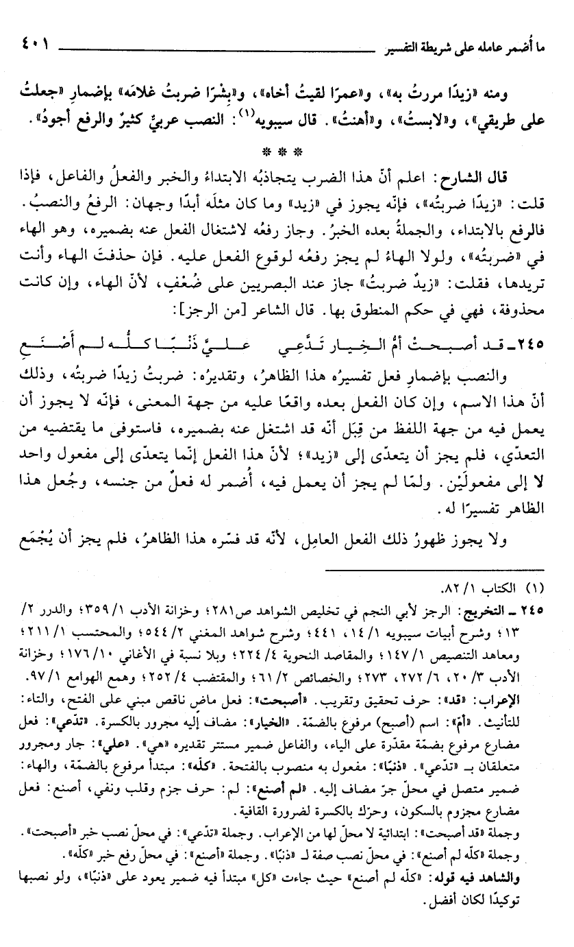 قال الشارح: اعلم أنّ هذا الضرب يتجاذبُه الابتداءُ والخبر والفعلُ والفاعل، فإذا قلت: "زيدًا ضربتُه"، فإنّه يجوز في "زيد" وما كان مثلَه أبدًا وجهان: الرفعُ والنصبُ. فالرفع بالابتداء، والجملةُ بعده الخبرُ. وجاز رفعُه لاشتغال الفعل عنه بضميره، وهو الهاء في "ضربتُه"، ولولا الهاءُ لم يجز رفعُه لوقوع الفعل عليه. فإن حذفتَ الهاء وأنت تريدها، فقلت: "زيدٌ ضربتُ" جاز عند البصريين على ضُعْفٍ، لأن الهاء، وإن كانت محذوفة، فهي في حكم المنطوق بها. قال الشاعر [من الرجز]: