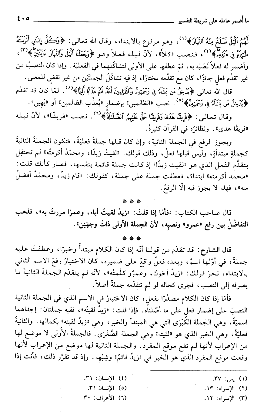 لَهُمُ اللَّيْلُ نَسْلَخُ مِنْهُ النَّهَارَ} (¬1)، وهو مرفوع بالابتداء، وقال الله تعالى: {وَكُلَّ إِنْسَانٍ أَلْزَمْنَاهُ طَائِرَهُ فِي عُنُقِهِ} (¬2)، فنصب "كلاَّ", لأنّ قبله فعلاً وهو {وَجَعَلْنَا اللَّيْلَ وَالنَّهَارَ آيَتَيْنِ} (¬3)، وأضمر له فعلاً نَصَبَه به، ثمّ عطفها على الأولى لتشاكُلهما في الفعلية. وإذا كان النصبُ من غير تقدُّم فعلٍ جائزًا، كان مع تقدُّمه مختارًا، إذ فيه تشاكُلُ الجملتَيْن من غير نقضٍ للمعنى.