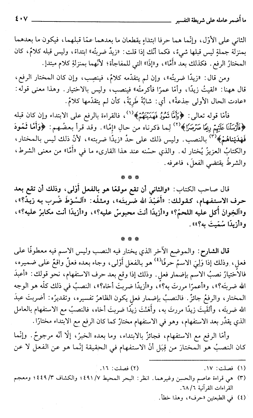 فأمّا قوله تعالى: {وَأَمَّا ثَمُودُ فَهَدَيْنَاهُمْ} (¬1)، فالقراءة بالرفع على الابتداء وإن كان قبله {فَأَرْسَلْنَا عَلَيْهِمْ رِيحًا صَرْصَرًا} (¬2) لِما ذكرناه من حالِ "إِمَّا". وقد قرأ بعضُهم: {وَأَمَّا ثَمُودُ فَهَدَيْنَاهُمْ} (¬3) بالنصب. وليس ذلك على حدِّ "زيدًا ضربته", لأن ذلك ليس بالمختار، والكتابُ العزيزُ يُختار له. والذي حسّنه عند هذا القارئ ما في "أَمَّا" من معنى الشرط، والشرطُ يقتضي الفعلَ، فاعرفه.