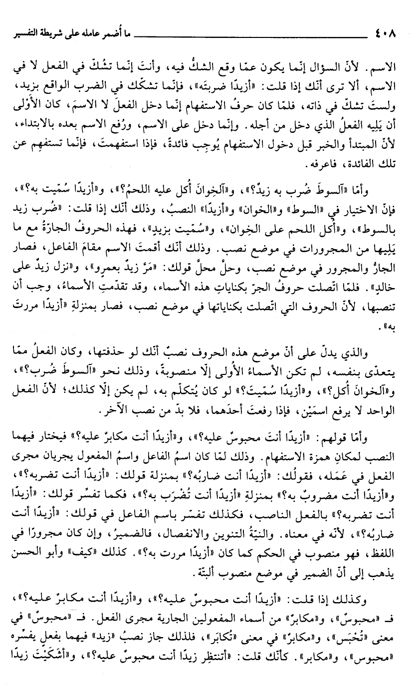 وأمّا قولهم: "أزيدًا أنتَ محبوسٌ عليه؟ "، و"أزيدًا أنت مكابرٌ عليه؟ " فيختار فيهما النصب لمكانِ همزة الاستفهام. وذلك لمّا كان اسمُ الفاعل واسمُ المفعول يجريان مجرى الفعل في عَمَله، فقولُك: "أزيدًا أنت ضاربُه؟ " بمنزلة قولك: "أزيدًا أنت تضربه؟ "، و"أزيدًا أنت مضروبٌ به؟ " بمنزلةِ "أزيدًا أنت تُضْرَب به؟ "، فكما تفسِّر قولك: "أزيدًا أنت تضربه؟ " بالفعل الناصب، فكذلك تفسّر باسم الفاعل في قولك: "أزيدًا أنت ضاربُه؟ ", لأنه في معناه. والنيّةُ التنوين والانفصال، فالضميرُ، وإن كان مجرورًا في اللفظ، فهو منصوب في الحكم كما كان "أزيدًا مررت به؟ ". كذلك "كيف" وأبو الحسن يذهب إلى أن الضمير في موضع منصوب ألبتّة.