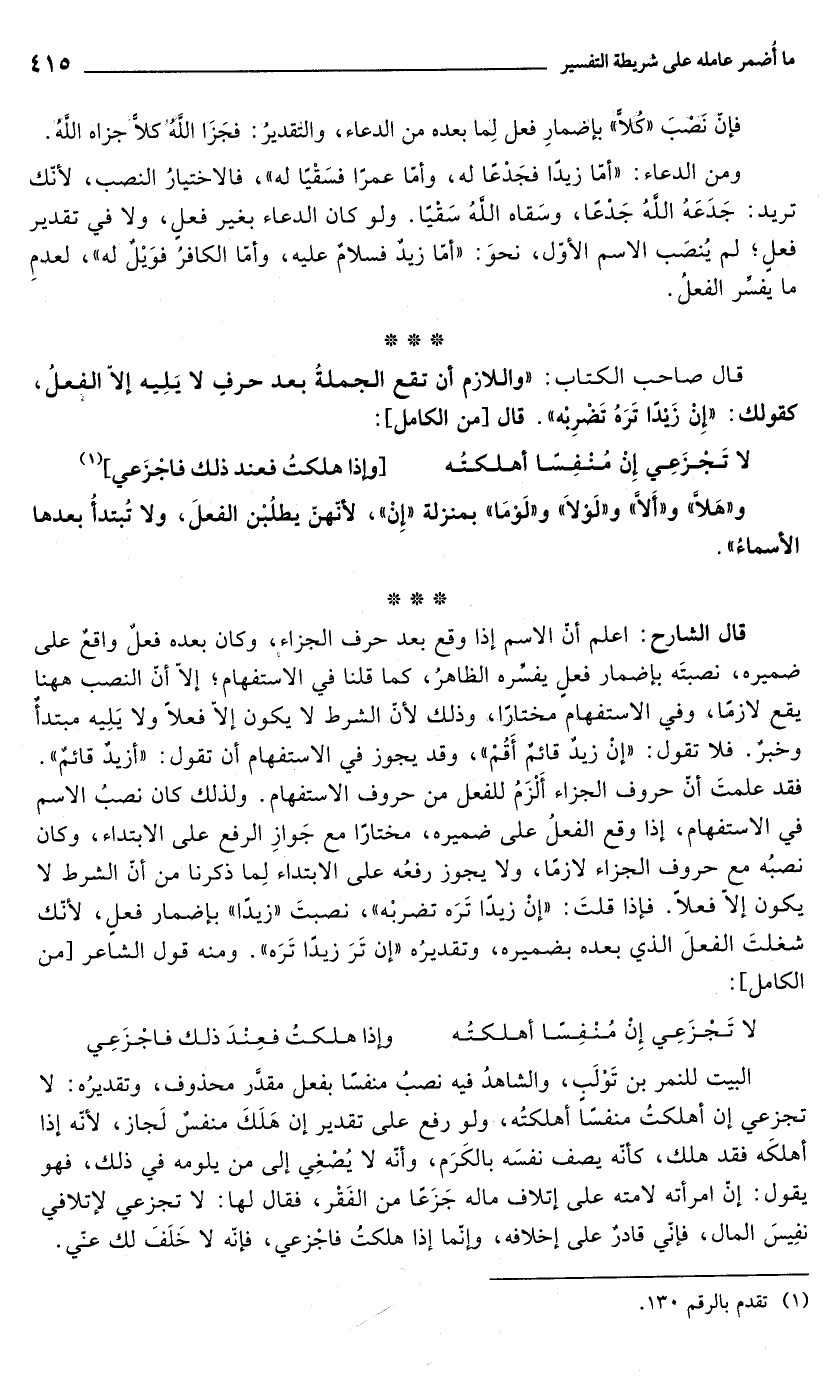 قال الشارح: اعلم أنّ الاسم إذا وقع بعد حرف الجزاء، وكان بعده فعلٌ واقعٌ على ضميره، نصبتَه بإضمار فعل يفسِّره الظاهرُ، كما قلنا في الاستفهام؛ إلّا أنّ النصب ههنا يقع لازمًا، وفي الاستفهام مختارًا، وذلك لأن الشرط لا يكون إلّا فعلًا ولا يَلِيه مبتدأُ وخبرٌ. فلا تقول: "إنْ زيدٌ قائمٌ أَقُمْ"، وقد يجوز في الاستفهام أن تقول: "أزيدٌ قائمٌ". فقد علمتَ أن حروف الجزاء أَلْزَمُ للفعل من حروف الاستفهام. ولذلك كان نصبُ الاسم في الاستفهام، إذا وقع الفعلُ على ضميره، مختارًا مع جَوازِ الرفع على الابتداء، وكان نصبُه مع حروف الجزاء لازمًا، ولا يجوز رفعُه على الابتداء لِما ذكرنا من أنّ الشرط لا يكون إلّا فعلًا. فإذا قلتَ: "إنْ زيدًا تَرَه تضربْه"، نصبتَ "زيدًا" بإضمار فعلٍ، لأنّك شغلتَ الفعلَ الذي بعده بضميره، وتقديرُه "إن تَرَ زيدًا تَرَه". ومنه قول الشاعر [من الكامل]: