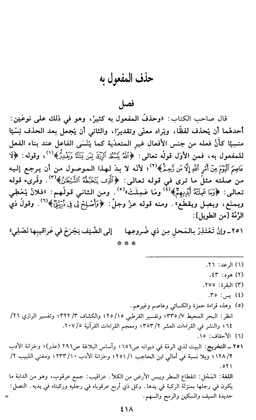 قال صاحب الكتاب: "وحذف المفعول به به كثير, وهو في ذلك على نوعين: أحدهما أن يحذف لفظاً ويراد معنى وتقديراً. والثاني أن يجعل بعد الحذف نسياً منسياً كأن فعله من جنس الأفعال غير المتعدية كما ينسى الفاعل عند بناء الفعل به. فمن الأول قوله تعالي: {الله يبسط الرزق لمن يشاء ويقدر} (¬1) , وقوله تعالى: {لا عاصم اليوم من أمر الله إلا من رحم} (¬2)؛ لأنه لا بد لهذا الموصول من أن يرجع إليه من صلته مثل ما ترى في قوله تعالى: {الذي يتخبطه الشيطان} (¬3). وقرئ قوله تعالى: {وما عملته أيديهم} (¬4) وما عملت" (¬5). من الثاني قولهم: "فلان يعطي ويمنع ويصل ويقطع". ومنه قوله عز وجل: {وأصلح لي في ذريتي} (¬6). وقول ذي الرمة [من الطويل]: