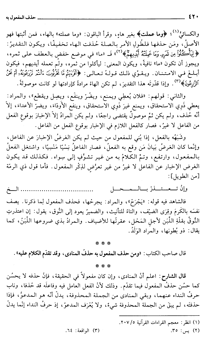 والثاني: قولهم: "فلان يُعطِي ويمنع، ويضُرّ وينفَع، ويصِل ويقطع"، والمراد: يعطي ذَوِي الاستحقاق، ويمنع غيرَ ذَوِي الاستحقاق، وينفع الأَودّاءَ، ويضرّ الأعداءَ، إلّا أنّه حُذف، ولم يكن ثمَّ موصولٌ يقتضى راجعًا، ولم يكن المرادُ إلّا الإخبارَ بوقوعِ الفعل من الفاعل لا غيرُ، فصار كالفعل اللازم في الإخبار بوقوع الفعل من الفاعل.