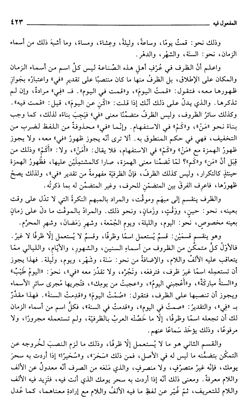 واعلم أنّ الظرف في عُرْفِ أهلِ هذه الصِّناعة ليس كلَّ اسم من أسماء الزمان والمكان على الإطلاق، بل الظرفُ منها ما كان منتصبًا على تقديرِ "في" واعتبارُه بجَوازِ ظهورها معه، فتقول: "قمتُ اليومَ"، و"قمت في اليوم". فـ "في" مرادةٌ، وإن لم تذكرها. والذي يدلّ على ذلك أنّك إذا قلت: "اكْنِ عن اليومَ"، قيل: "قمت فيه". وكذلك سائرُ الظروف، وليس الظرفُ متضمِّنًا معنى "في" فيَجِبَ بناءُه لذلك، كما وجب بناءُ نحو"مَنْ"، و"كَمْ" في الاستفهام. وإنّما "في" محذوفةٌ من اللفظ لضرب من التخفيف، فهي في حكم المنطوق به. ألا ترى أنّه يجوز ظهورُ "في" معه، ولا يجوز ظهورُ الهمزة مع "مَنْ" و"كَمْ" في الاستفهام، فلا يقال: "أَمَنْ"، ولا: "أَكَمْ" وذلك من قِبَل أن "مَن" و"كَم"؟ لمّا تَضمَّنا معنى الهمزة، صارا كالمشتمِلَيْن عليها، فظُهورُ الهمزة حينئذ كالتكرار، وليس كذلك الظرفُ، فإن الظرفيّة مفهومةٌ من تقدير "في"، ولذلك يصحّ ظهورُها، فاعرِف الفرقَ بين المتضمّنِ للحرف، وغير المتضمِّن له بما ذكرتُه.
