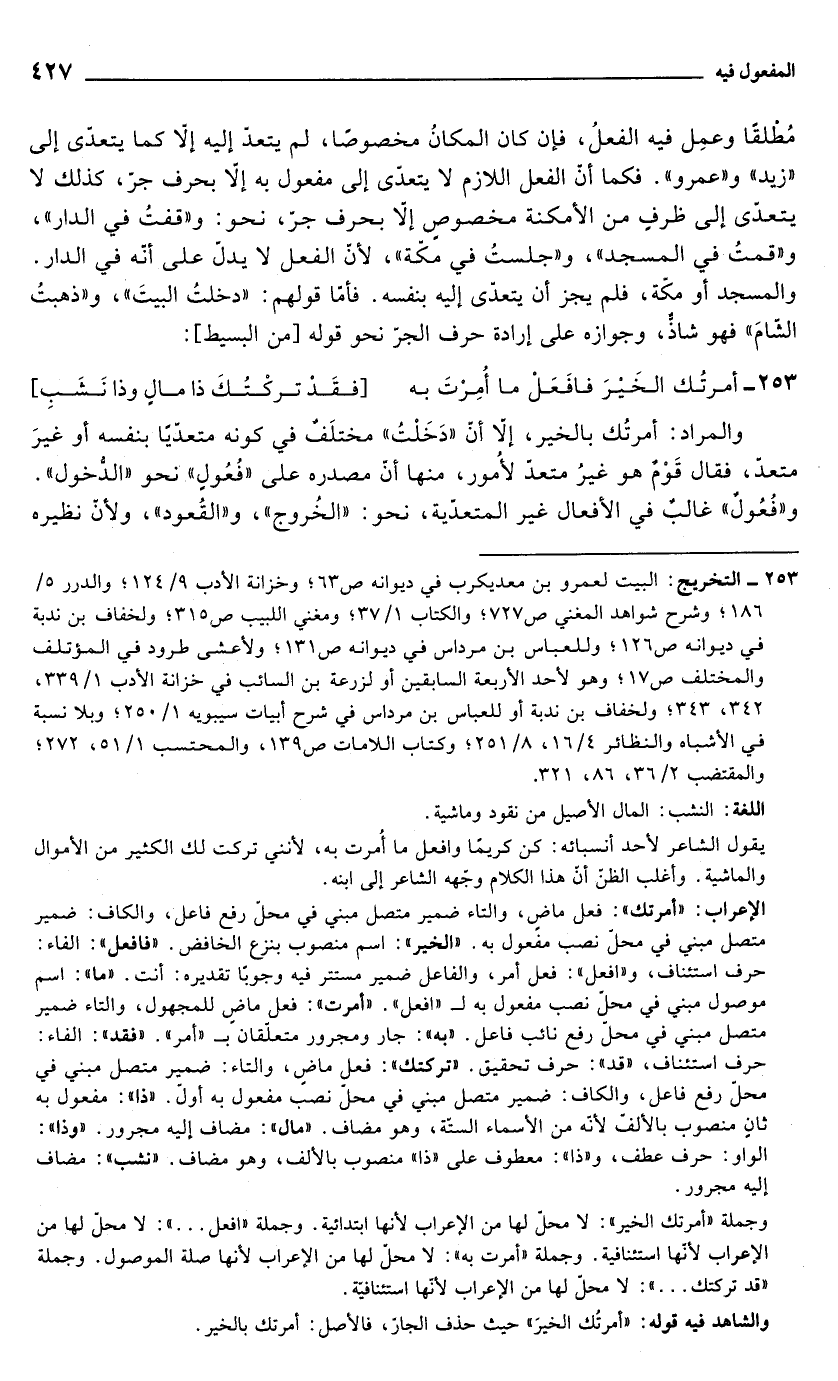الإعراب: "أمرتك": فعل ماضٍ، والتاء ضمير متصل مبني في محلّ رفع فاعل، والكاف: ضمير متصل مبني في محلّ نصب مفعول به. "الخير": اسم منصوب بنزع الخافض. "فافعل": الفاء: حرف استئناف، و"افعل": فعل أمر، والفاعل ضمير مستتر فيه وجوبًا تقديره: أنت. "ما": اسم موصول مبني في محلّ نصب مفعول به لـ "افعل". "أمرت": فعل ماضٍ للمجهول، والتاء ضمير متصل مبني في محلّ رفع نائب فاعل. "به": جار ومجرور متعلّقان بـ "أمر"."فقد": الفاء: حرف استئناف، "قد": حرف تحقيق. "تركتك": فعل ماضٍ، والتاء: ضمير متصل مبني في محلّ رفع فاعل، والكاف: ضمير متصل مبني في محلّ نصب مفعول به أول. "ذا": مفعول به ثانٍ منصوب بالألفّ لأنّه من الأسماء الستّة، وهو مضاف. "مال": مضاف إليه مجرور. "وذا": الواو: حرف عطف، و"ذا": معطوف على "ذا" منصوب بالألف، وهو مضاف. "نشب": مضاف إليه مجرور.