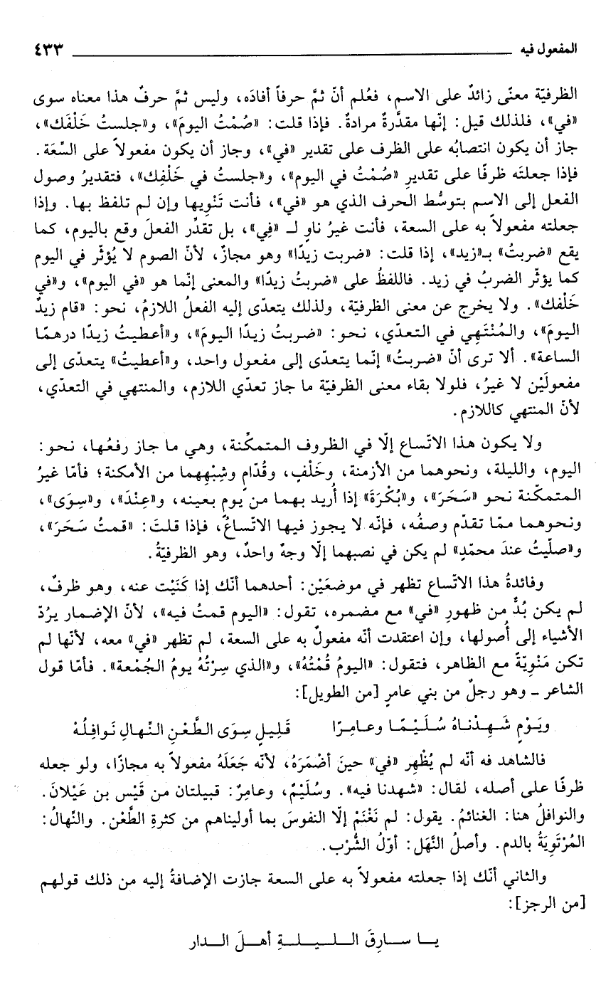 الظرفية معنّى زائدٌ على الاسم، فعُلم أنّ ثمَّ حرفًا أفادَه، وليس ثمَّ حرفٌ هذا معناه سوى "في"، فلذلك قيل: إنّها مقدَّرةٌ مرادةٌ. فإذا قلت: "صُمْتُ اليومَ"، و"جلستُ خَلْفَك"، جاز أن يكون انتصابُه على الظرف على تقدير "في"، وجاز أن يكون مفعولًا على السِّعَة. فإذا جعلتَه ظرفًا على تقديرِ "صُمْتُ في اليوم"، و"جلستُ في خَلْفِك"، فتقديرُ وصول الفعل إلى الاسم بتوسُّط الحرف الذي هو "في"، فأنت تَنْوِيها وإن لم تلفظ بها. وإذا جعلته مفعولًا به على السعة، فأنت غيرُ ناوٍ لـ "في"، بل تقدِّر الفعلَ وقع باليوم، كما يقع "ضربتُ" بـ "زيد"، إذا قلت: "ضربت زيدًا" وهو مجازٌ, لأنّ الصوم لا يُؤثّر في اليوم كما يؤثّر الضربُ في زيد. فاللفظُ على "ضربتُ زيدًا" والمعنى إنّما هو "في اليوم"، و"في خَلْفك". ولا يخرج عن معنى الظرفيّة، ولذلك يتعدّى إليه الفعلُ اللازمُ، نحو: "قام زيدٌ اليومَ"، والمُنْتَهِي في التعدّي، نحو: "ضربتُ زيدًا اليومَ"، و"أعطيتُ زيدًا درهمًا الساعة". ألا ترى أنّ "ضربتُ" إنما يتعدّى إلى مفعول واحد، و"أعطيتُ" يتعدّى إلى مفعولَيْن لا غيرُ، فلولا بقاء معنى الظرفيّة ما جاز تعدّي اللازم، والمنتهي في التعدّي، لأنّ المنتهي كاللازم.
