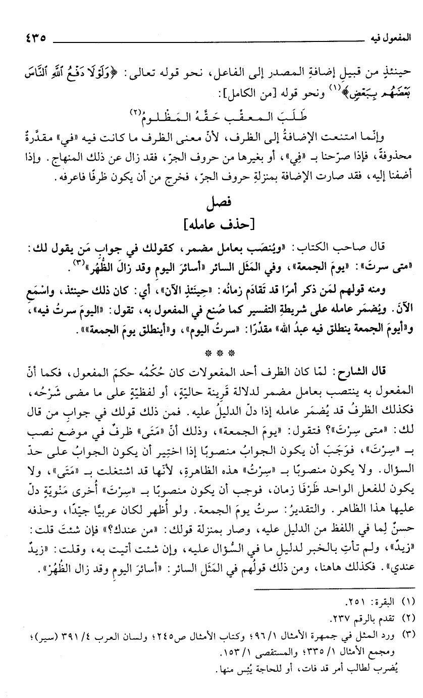 قال الشارح: لمّا كان الظرف أحد المفعولات كان حُكْمُه حكمَ المفعول، فكما أنّ المفعول به ينتصب بعامل مضمر لدلالة قَرِينة حاليّةٍ، أو لفظيّةٍ على ما مضى شَرْحُه، فكذلك الظرفُ قد يُضمَر عامله إذا دلّ الدليلُ عليه. فمن ذلك قولك في جوابِ من قال لك: "متى سِرْتَ "؟ فتقول: "يومَ الجمعة"، وذلك أنّ "مَتَى" ظرفٌ في موضع نصب بـ "سِرْتَ"، فوَجَبَ أن يكون الجوابُ منصوبًا إذا اختِير أن يكون الجوابُ على حدّ السؤال. ولا يكون منصوبًا بـ "سِرْتُ" هذه الظاهرةِ، لأنّها قد اشتغلت بـ "مَتَى"، ولا يكون للفعل الواحد ظَرْفَا زمان، فوجب أن يكون منصوبًا بـ "سِرْتَ" أُخرى مَنْويّةٍ دلّ عليها هذا الظاهر. والتقديرُ: سرتُ يومَ الجمعة. ولو أُظهر لكان عربيًّا جيّدًا، وحذفه حسنٌ لِما في اللفظ من الدليل عليه، وصار بمنزلة قولك: "من عندك؟ " فإن شئتَ قلت: "زيدٌ"، ولم تأتِ بالخبر لدليلِ ما في السُّؤال عليه، وإن شئت أتيت به، وقلت: "زيدٌ عندي". فكذلك ها هنا، ومن ذلك قولُهم في المَثَل السائر: "أسائرَ اليومِ وقد زال الظُهُرْ".