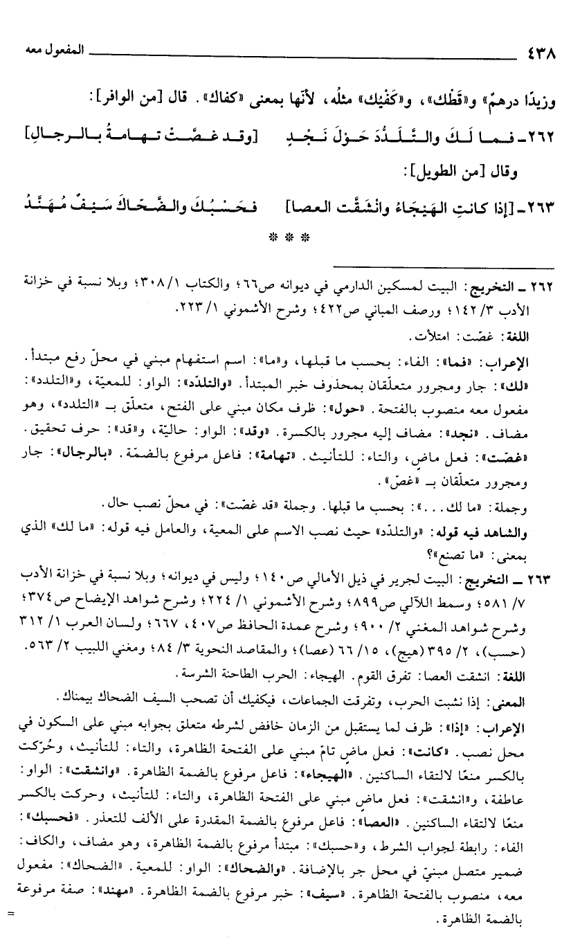 263 - التخريج: البيت لجرير في ذيل الأمالي ص 140؛ وليس في ديوانه؛ وبلا نسبة في خزانة الأدب 7/ 581؛ وسمط اللآلي ص 899؛ وشرح الأشموني 1/ 224؛ وشرح شواهد الإيضاح ص 374؛ وشرح شواهد المغني 2/ 900؛ وشرح عمدة الحافظ ص 407، 667؛ ولسان العرب 1/ 312 (حسب)، 2/ 395 (هيج)، 15/ 66 (عصا)؛ والمقاصد النحوية 3/ 84؛ ومغني اللبيب 2/ 563.