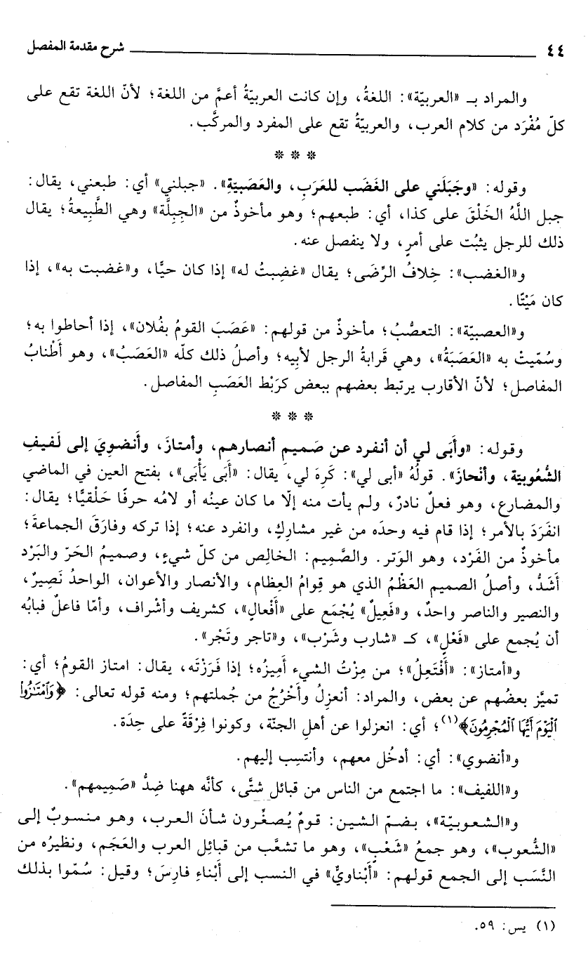 وقوله: "وأَبَى لي أن أنفرد عن صَميم أنصارهم، وأمتازَ، وأَنضوِيَ إلى لَفيفِ الشعُوبيّه، وأنْحازَ". قولُهُ "أبى لي": كَرِهَ لي، يقال: "أَبَى يَأْبَى"، بفتح العين في الماضي والمضارع، وهو فعلٌ نادرٌ، ولم يأت منه إلاَّ ما كان عينُه أو لامُه حرفاً حَلْقيًّا؛ يقال: انفَرَدَ بالأمر؛ إذا قام فيه وحدَه من غير مشارِكِ، وانفرد عنه؛ إذا تركه وفارَقَ الجماعةَ؛ مأخوذ من الفَرْد، وهو الوَتر. والصَّمِيم: الخالِص من كلّ شيء، وصميمُ الحَرّ والبَرْد أشَدُّ، وأصلُ الصميم العَظْمُ الذي هو قِوامُ العِظام، والأنصار والأعوان، الواحدُ نَصِيرٌ، والنصير والناصر واحدٌ، و"فَعِيلٌ" يُجْمَع على "أَفْعالٍ"، كشريف وأشْراف، وأمّا فاعلٌ فبابُه أن يُجمع على "فَعْلٍ"، كـ"شارب وشَرْب"، و"تاجر وتَجْر".