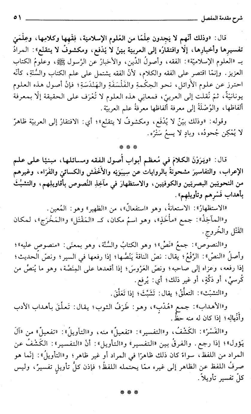 قال: "وذلك أنّهم لا يَجِدون عِلْمًا من العُلوم الإِسلاميّه، فِقْهِها وكلامِها، وعِلْمَي تفسيرِها وأخبارِها، إلاَّ وافتقارُه إلى العربيّة بيّنٌ لا يُدْفع، ومكشوفٌ لا يتقنّع": المرادُ بـ"العلوم الإِسلامية": الفقه، وأصولُ الدِّبن، والأخبارُ عن الرَّسول - صلى الله عليه وسلم -، وعلومُ الكتاب العزيز. وإنمّا اقتصر على الفقه والكلام, لأنّ الفقه يشتمل على علم الكتاب والسُّنّةِ، كأنّه احترز عن علوم الأَوائل، نحو الحِكْمةِ والفَلْسَفَةِ والهَنْدَسَةِ؛ فإنّ أصول هذه العلوم يونانيّةٌ، ثم نُقلت إلى العربيّ، فمعانِي هذه العلوم لا تُعْرَف على الحقيقة إلاَّ بمعرفة ألفاظها، والوُصلَةُ إلى معرفة ألفاظها معرفةُ علم العربيّة.