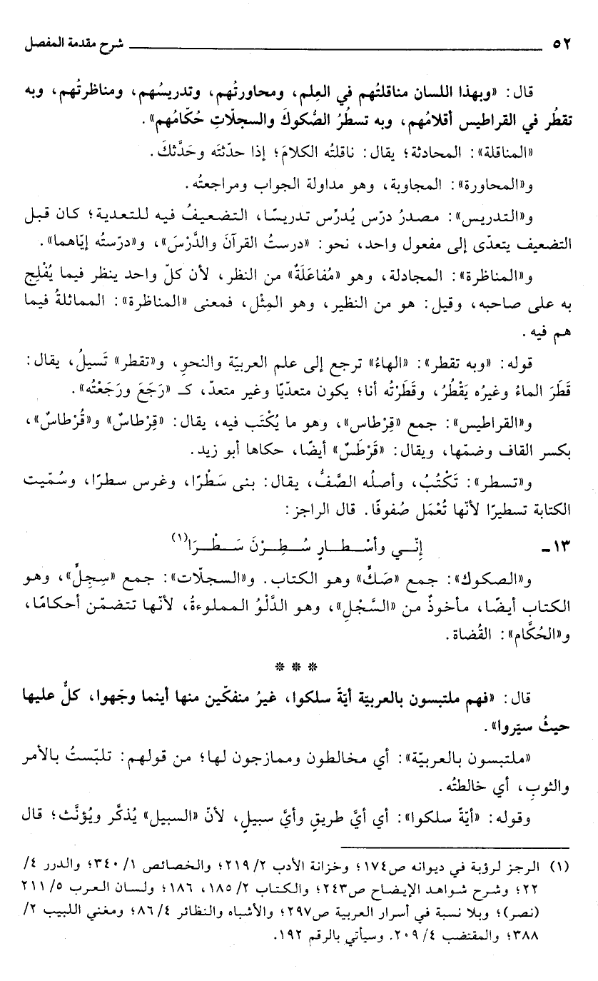 قال: "وبهذا اللسان مناقلتُهم في العِلم، ومحاورتُهم، وتدريسُهم، ومناظرتُهم، وبه تقطُر في القراطيس أقلامُهم، وبه تسطُرُ الصُّكوكَ والسجلّاتِ حُكّامُهم".