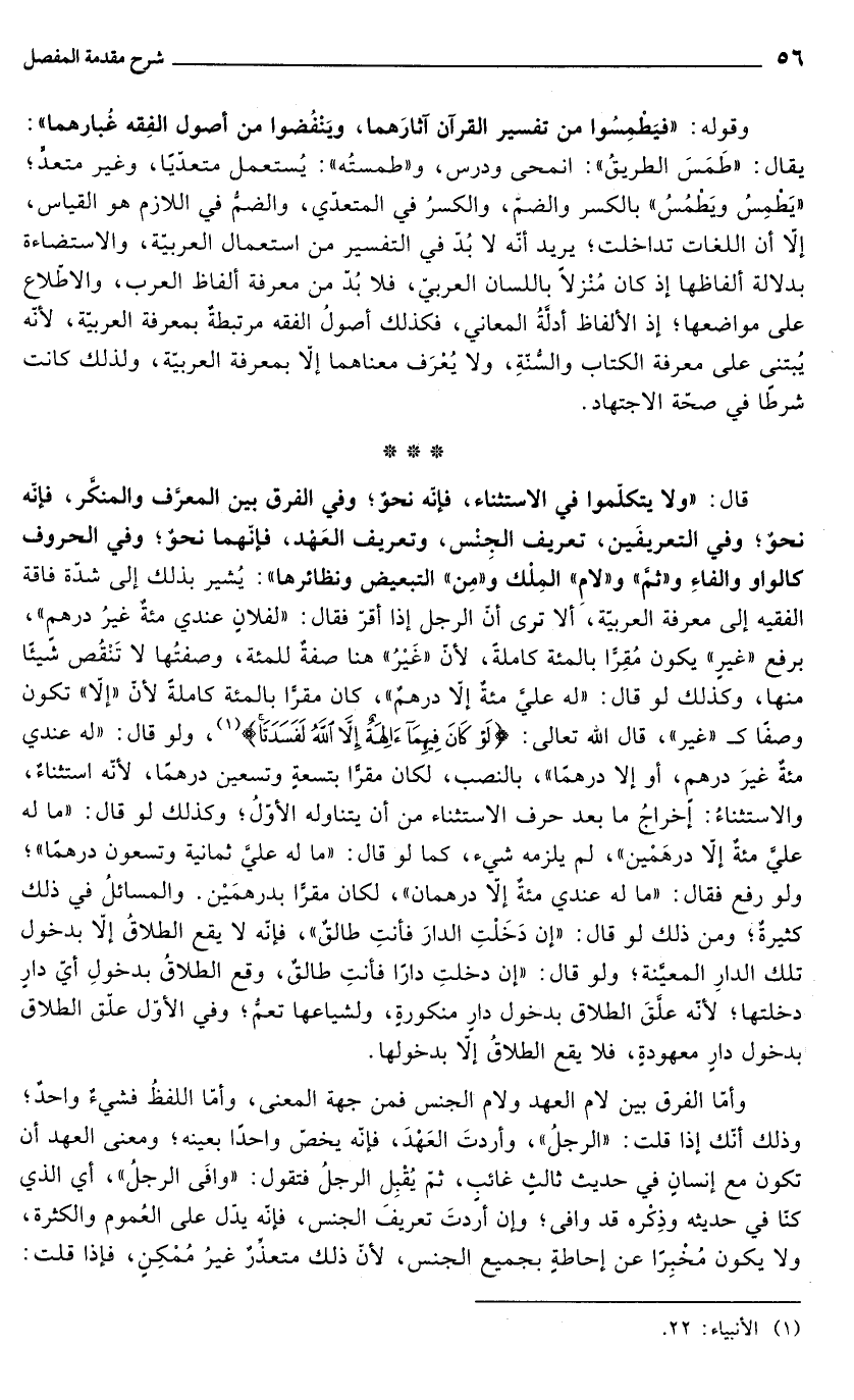قال: "ولا يتكلّموا في الاستثناء، فإنّه نحوٌ؛ وفي الفرق بين المعرَّف والمنكَّر، فإنّه نحوٌ؛ وفي التعريفَين، تعريف الجِنْس، وتعريف العَهْد، فإنهما نحوٌ؛ وفي الحروف كالواو والفاءِ و"ثمَّ" و"لامِ" المِلْك و"مِن" التبعيض ونظائرها": يُشير بذلك إلى شدّة فاقة الفقيه إلى معرفة العربيّة، ألا ترى أنّ الرجل إذا أقرّ فقال: "لفلانٍ عندي مئةٌ غيرُ درهم"، برفع "غير" يكون مُقِرًّا بالمئة كاملة, لأنّ "غَيْرُ" هنا صفة للمئة، وصفتُها لا تَنْقُص شَيئًا منها، وكذلك لو قال: "له علىَّ مئةٌ إلَّا درهمٌ"، كان مقرًّا بالمئة كاملةً لأنّ "إلّا" تكون وصفًا كـ"غير"، قال الله تعالى: {لَوْ كَانَ فِيهِمَا آلِهَةٌ إِلَّا اللَّهُ لَفَسَدَتَا} (¬1)، ولو قال: "له عندي مئةٌ غيرَ درهم، أو إلا درهمًا"، بالنصب، لكان مقرًّا بتسعةٍ وتسعين درهمًا, لأنه استثناءٌ، والاستثناءُ: إخراجُ ما بعد حرف الاستثناء من أن يتناوله الأوَّلُ؛ وكذلك لو قال: "ما له عليَّ مئةٌ إلّا درهَمْين"، لم يلزمه شيء، كما لو قال: "ما له عليَّ ثمانية وتسعون درهمًا"؛ ولو رفع فقال: "ما له عندي مئةٌ إلَّا درهمان"، لكان مقرًّا بدرهمَيْن. والمسائلُ في ذلك كثيرة؛ ومن ذلك لو قال: "إن دَخَلْتِ الدارَ فأنتِ طالقٌ"، فإنّه لا يقع الطلاقُ إلّا بدخول تلك الدارِ المعيَّنة؛ ولو قال: "إن دخلتِ دارًا فأنتِ طالقٌ، وقع الطلاقُ بدخولِ أيّ دارٍ دخلتها؛ لأنّه علَّقَ الطلاق بدخول دارٍ منكورةٍ، ولشياعها تعمُّ؛ وفي الأوّل علّق الطلاق بدخول دارٍ معهودةٍ، فلا يقع الطلاقُ إلّا بدخولها.