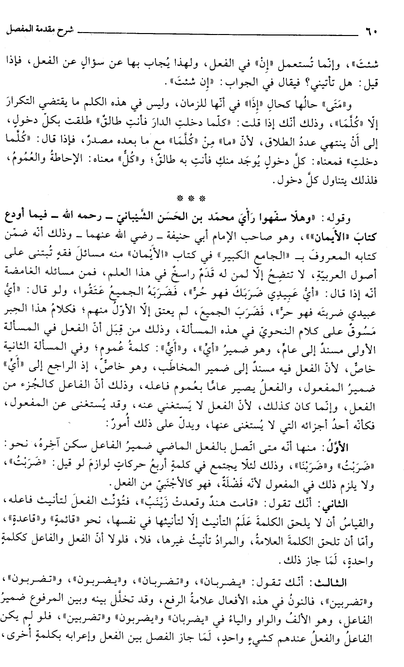 وقوله: "وهلّا سفّهوا رَأْيَ محمّد بن الحَسَنُ الشَّيبانيّ - رحمه الله - فيما أودع كتابَ "الأيَمان""، وهو صاحب الإِمام أبي حنيفة -رضي الله عنهما- وذلك أنّه ضمّن كتابه المعروفَ بـ"الجامع الكبير" في كتاب "الأيمان" منه مسائلَ فقهٍ تُبتنى على أصول العربيّةِ، لا تتضِحُ إلّا لمن له قَدَمٌ راسخٌ في هذا العلم، فمن مسائله الغامضة أنَّه إذا قال: "أيُّ عَبِيدِي ضَرَبَكَ فهو حُرٌّ"، فَضَرَبَهُ الجميعُ عَتَقُوا، ولو قال: "أيُّ عبيدي ضربتَه فهو حرٌّ"، فَضَرَبَ الجميعَ، لم يعتق إلّا الأوّلُ منهم؛ فكلامُ هذا الحِبر مَسُوقٌ على كلام النحويّ في هذه المسألة، وذلك من قِبَل أنّ الفعل في المسألة الأولى مسندٌ إلى عامٍّ، وهو ضميرُ "أيٍّ"، و"أَيٌّ": كلمةُ عُموم؛ وفي المسألة الثانية خاصٌّ, لأنّ الفعل فيه مسندٌ إلى ضمير المخاطَب، وهو خاصٌّ، إذ الراجع إلى "أَيٍّ" ضميرُ المفعول، والفعلُ يصير عامًّا بعُموم فاعله، وذلك أنّ الفاعل كالجُزء من الفعل، وإنّما كان كذلك, لأنّ الفعل لا يَستغني عنه، وقد يُستغنى عن المفعول، فكأنّه أحدُ أجزائه التي لا يُستغنى عنها، ويدلّ على ذلك أُمورٌ: