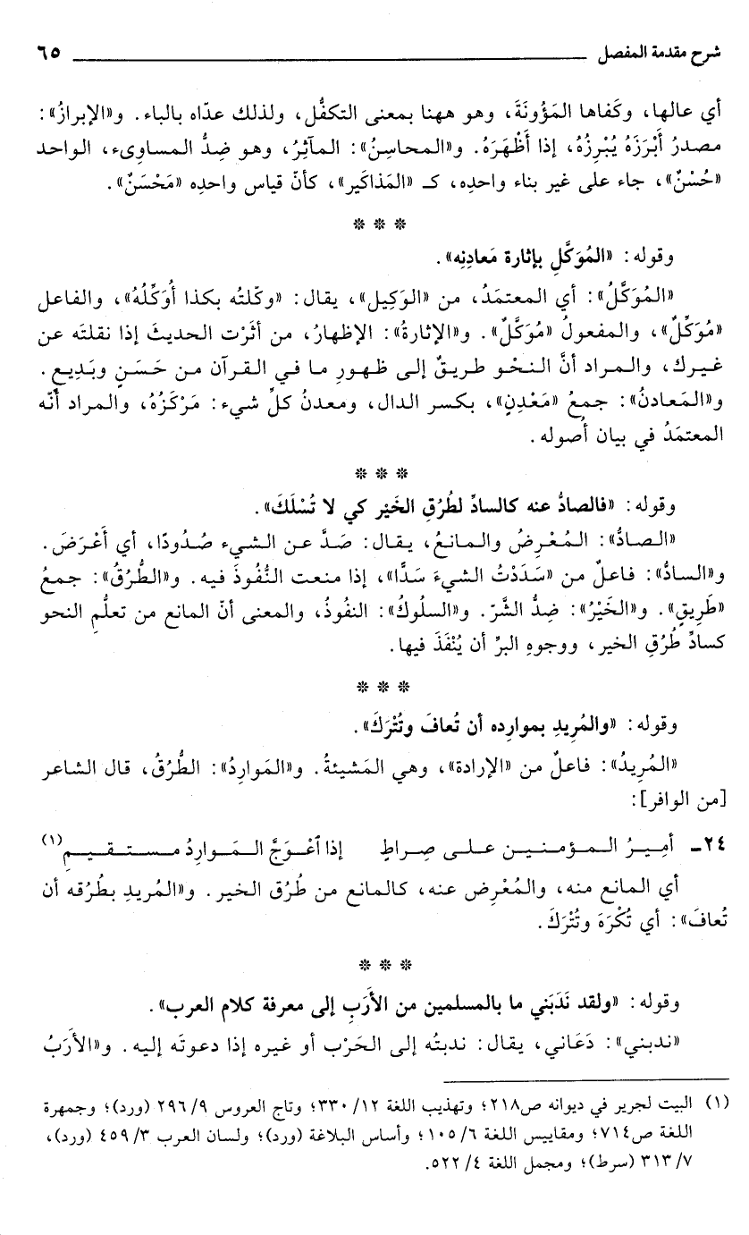 "المُوَكَّلُ": أي المعتمَدُ، من "الوَكِيل"، يقال: "وكّلتُه بكذا أُوَكِّلُهُ"، والفاعل "مُوَكَّلٌ"، والمفعولُ "مُوَكَّلٌ". و"الإثارةُ": الإظهارُ، من أثَرْت الحديثَ إذا نقلتَه عن غيرك، والمراد أنَّ النحْو طريقٌ إلى ظهورِ ما في القرآن من حَسَنٍ وبَدِيع. و"المَعادنُ": جمعُ "مَعْدِنٍ"، بكسر الدال، ومعدنُ كلِّ شيء: مَرْكَزُهُ، والمراد أنّه المعتمَدُ في بيان أُصوله.
