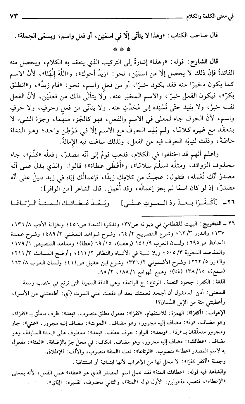 واعلم أنّهم قد اختلفوا في الكلام، فذهب قومٌ إلى أنّه مصدرٌ، وفعلُه "كلَّمَ"، جاء محذوف الزوائد، ومثلُه "سلَّمَ سلامًا"، و"أَعْطَى عطاءً"؛ قالوا: والذي يدلّ على أنّه مصدرٌ، أنّك تُعْمِله، فتقول: عجبتُ من كلامِك زيدًا، فإعمالُك إيّاه في زيد دليلٌ على أنّه مصدرٌ، إذ لو كان اسما لم يجز إعمالُه، وقد أُعْمِل. قال الشاعر [من الوافر]: