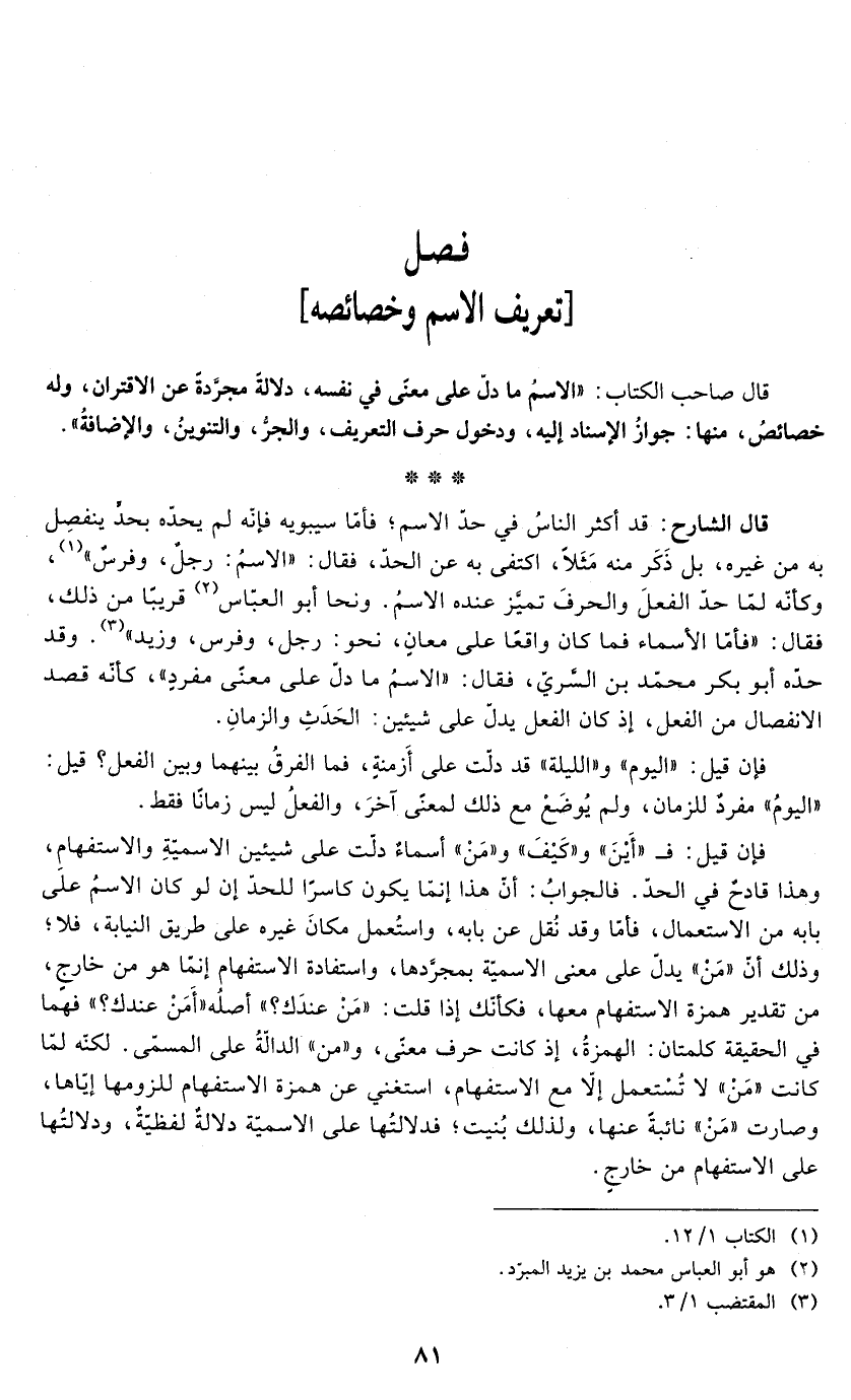 قال صاحب الكتاب: "الاسم ما دلّ علي معني في نفسه, دلالة مجرَّدة عن الاقتران, وله خصائص, منها: جواز الإسناد إليه, ودخول حرف التعريف, والجرُّ, والتنوين, والإضافة".