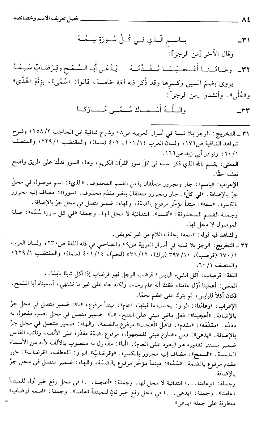 31 - التخريج: الرجز بلا نسبة في أسرار العربية ص 8؛ وشرح شافية ابن الحاجب 2/ 258؛ وشرح شواهد الشافة ص 176؛ ولسان العرب 14/ 401، 402 (سما)؛ والمقتضب 1/ 229؛ والمنصف 1/ 60؛ ونوادر أبي زيد ص 166.