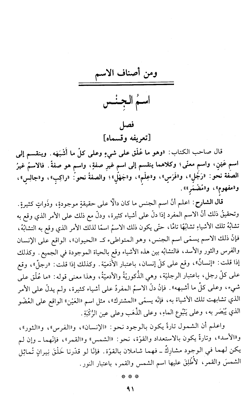 قال الشارح: اعلم أن اسم الجنس ما كان دالا علي حقيقةٍ موجودةٍ, وذواتٍ كثيرةٍ. وتحقيقُ ذلك أنّ الاسم المفرد إذا دلّ على أشياء كثيرة، ودلّ مع ذلك على الأمر الذي وقع به تشابُهُ تلك الأشياءِ تشابُهًا تامًّا، حتى يكون ذلك الاسمُ اسمًا لذلك الأمر الذي وقع به التشابُهُ، فإنّ ذلك الاسم يسمّى اسم الجنس، وهو المتواطىء كـ "الحيوان"، الواقع على الإنسان والفرس والثور والأسد، فالتشابُه بين هذه الأشياء وقع بالحياة الموجودة في الجميع. وكذلك إذا قلت: "إنسانٌ"، وقع على كلّ إنسان، باعتبار الأَدَميّة. وكذلك إذا قلت: "رجلٌ"، وقع على كلّ رجل، باعتبار الرجليّة، وهي الذُّكوريّةُ والأدميّةُ، وهذا معنى قوله: "ما عُلّق على شيء، وعلى كلِّ ما أشبهه". فإنْ دلّ الاسمُ المفردُ على أشياء كثيرة، ولم يدلّ على الأمر الذي تشابهت تلك الأشياءُ به، فإنّه يسمّى "المشترك"، مثل اسم "العَيْن" الواقع على العُضْو الذي يُبْصَر به، وعلى يَنْبُوع الماءِ، وعلى الذهَب وعلى عين الرُّكْبَةِ.