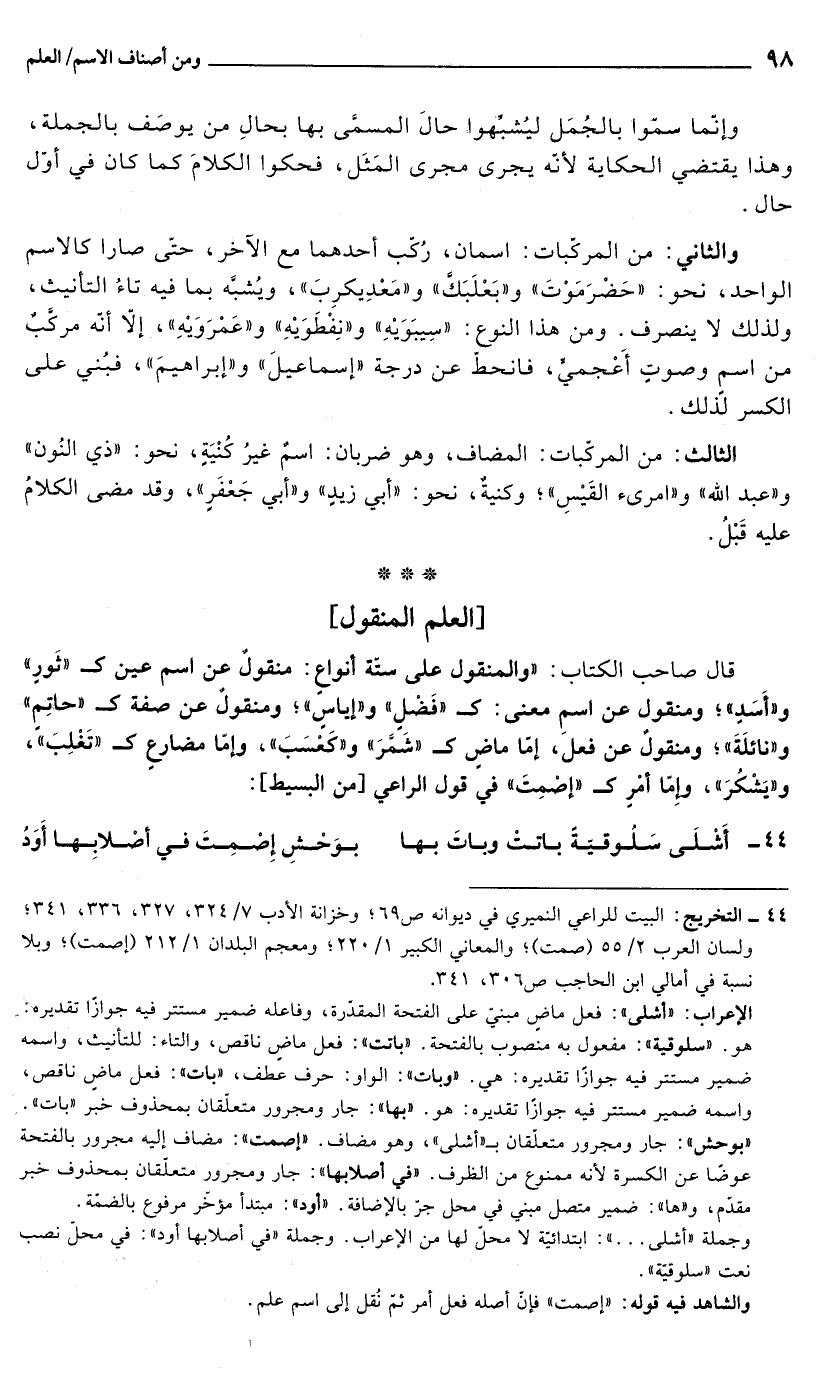 قال صاحب الكتاب: "والمنقول على ستة أنواع: منقولٌ عن اسم عين كـ "ثور" و"أسد"؛ ومنقول عن اسم معنى: كفضل وإياس، ومنقول عن صفة كحاتم ونائلة؛ ومنقول عن فعل إما ماضٍ كشمر وكعسب، وإما مضارع كتغلب ويشكر، وإما أمر كـ "إصمت" في قول الراعي [من البسيط]:
