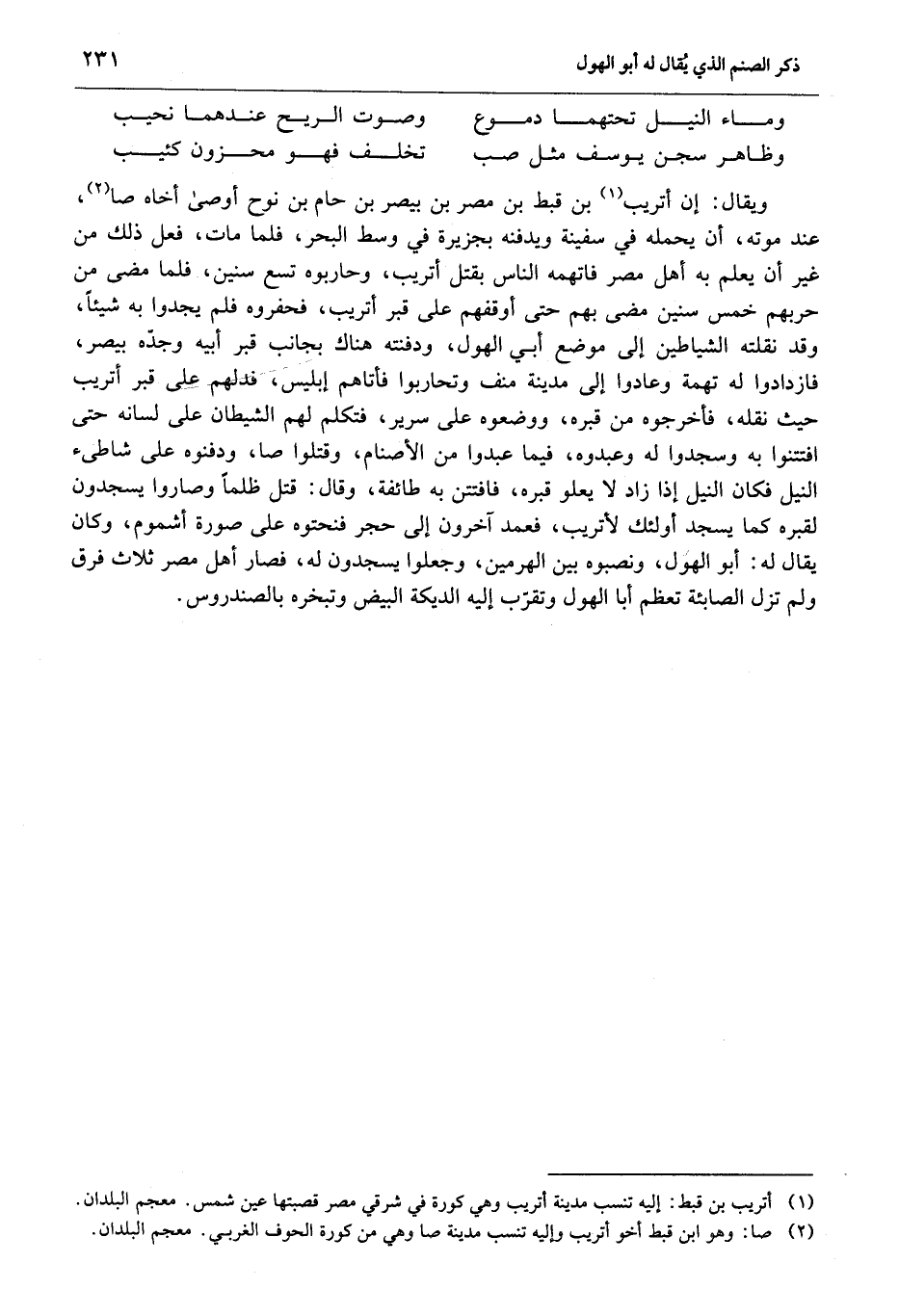 ويقال: إن أتريب «1» بن قبط بن مصر بن بيصر بن حام بن نوح أوصى أخاه صا «2» ، عند موته، أن يحمله في سفينة ويدفنه بجزيرة في وسط البحر، فلما مات، فعل ذلك من غير أن يعلم به أهل مصر فاتهمه الناس بقتل أتريب، وحاربوه تسع سنين، فلما مضى من حربهم خمس سنين مضى بهم حتى أوقفهم على قبر أتريب، فحفروه فلم يجدوا به شيئا، وقد نقلته الشياطين إلى موضع أبي الهول، ودفنته هناك بجانب قبر أبيه وجدّه بيصر، فازدادوا له تهمة وعادوا إلى مدينة منف وتحاربوا فأتاهم إبليس، فدلهم على قبر أتريب حيث نقله، فأخرجوه من قبره، ووضعوه على سرير، فتكلم لهم الشيطان على لسانه حتى افتتنوا به وسجدوا له وعبدوه، فيما عبدوا من الأصنام، وقتلوا صا، ودفنوه على شاطىء النيل فكان النيل إذا زاد لا يعلو قبره، فافتتن به طائفة، وقال: قتل ظلما وصاروا يسجدون لقبره كما يسجد أولئك لأتريب، فعمد آخرون إلى حجر فنحتوه على صورة أشموم، وكان يقال له: أبو الهول، ونصبوه بين الهرمين، وجعلوا يسجدون له، فصار أهل مصر ثلاث فرق ولم تزل الصابئة تعظم أبا الهول وتقرّب إليه الديكة البيض وتبخره بالصندروس.