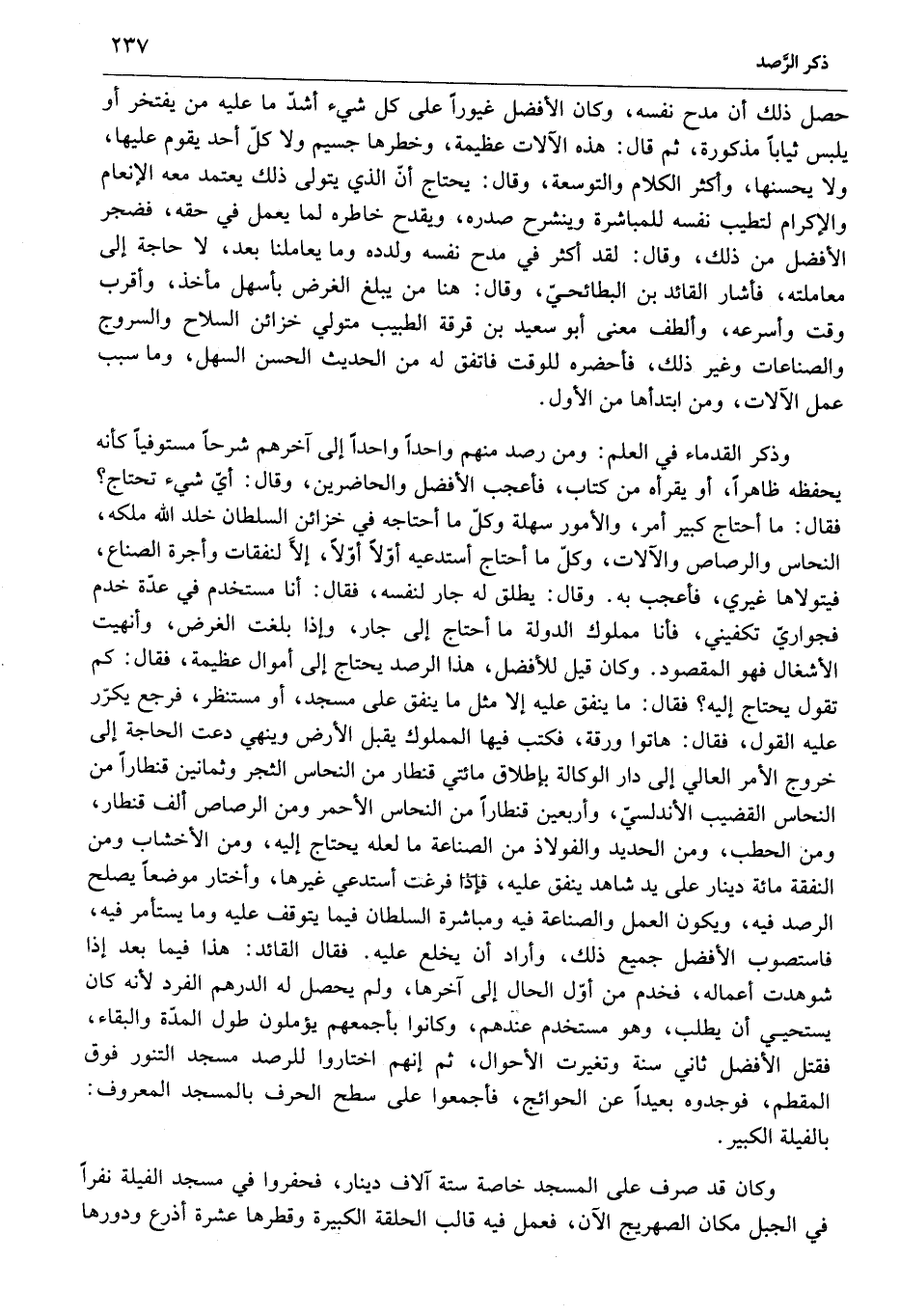 فقال: ما أحتاج كبير أمر، والأمور سهلة وكلّ ما أحتاجه في خزائن السلطان خلد الله ملكه، النحاس والرصاص والآلات، وكلّ ما أحتاج أستدعيه أوّلا أوّلا، إلّا لنفقات وأجرة الصناع، فيتولاها غيري، فأعجب به. وقال: يطلق له جار لنفسه، فقال: أنا مستخدم في عدّة خدم فجواريّ تكفيني، فأنا مملوك الدولة ما أحتاج إلى جار، وإذا بلغت الغرض، وأنهيت الأشغال فهو المقصود. وكان قيل للأفضل، هذا الرصد يحتاج إلى أموال عظيمة، فقال: كم تقول يحتاج إليه؟ فقال: ما ينفق عليه إلا مثل ما ينفق عليه مسجد، أو مستنظر، فرجع يكرّر عليه القول، فقال: هاتوا ورقة، فكتب فيها المملوك يقبل الأرض وينهي دعت الحاجة إلى خروج الأمر العالي إلى دار الوكالة بإطلاق مائتي قنطار من النحاس الثجر وثمانين قنطارا من النحاس القضيب الأندلسيّ، وأربعين قنطارا من النحاس الأحمر ومن الرصاص ألف قنطار، ومن الحطب، ومن الحديد والفولاذ من الصناعة ما لعله يحتاج إليه، ومن الأخشاب ومن النفقة مائة دينار على يد شاهد ينفق عليه، فإذا فرغت أستدعي غيرها، وأختار موضعا يصلح الرصد فيه، ويكون العمل والصناعة فيه ومباشرة السلطان فيما يتوقف عليه وما يستأمر فيه، فاستصوب الأفضل جميع ذلك، وأراد أن يخلع عليه. فقال القائد: هذا فيما بعد إذا شوهدت أعماله، فخدم من أوّل الحال إلى آخرها، ولم يحصل له الدرهم الفرد لأنه كان يستحيي أن يطلب، وهو مستخدم عندهم، وكانوا بأجمعهم يؤملون طول المدّة والبقاء، فقتل الأفضل ثاني سنة وتغيرت الأحوال، ثم إنهم اختاروا للرصد مسجد التنور فوق المقطم، فوجدوه بعيدا عن الحوائج، فأجمعوا على سطح الحرف بالمسجد المعروف: