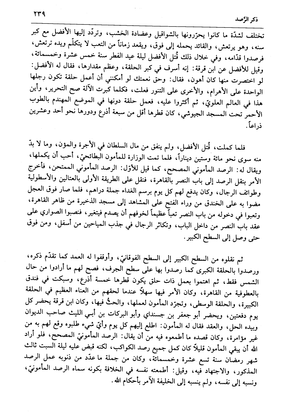 ثم نقلوه من السطح الكبير إلى السطح الفوقانيّ، وأوقفوا له العمد كما تقدّم ذكره، ورصدوا بالحلقة الكبرى كما رصدوا بها على سطح الجرف، فصح لهم ما أرادوا من حال الشمس فقط، ثم اهتموا بعمل ذات حلق يكون قطرها خمسة أذرع، وسبكت في فندق بالعطوفية من القاهرة، وكان الأمر فيها سهلا عندما لحقهم من العناء العظيم في الحلقة الكبيرة، والحلقة الوسطى، وتجرّد المأمون لعملها، والحثّ فيها، وكان ابن قرقة يحضر كل يوم دفعتين، ويحضر أبو جعفر بن جسنداي وأبو البركات بن أبي الليث صاحب الديوان وبيده الحل، والعقد فقال له المأمون: اطلع إليهم كل يوم وأيّ شيء طلبوه وقع لهم به من غير مؤامرة، وكان قصده ما أطمعوه فيه من أن يقال: الرصد المأمونيّ المصحح، فلو أراد الله أن يبقي المأمون قليلا كان كمل جميع رصد الكواكب، لكنه قبض عليه ليلة السبت ثالث شهر رمضان سنة تسع عشرة وخمسمائة، وكان من جملة ما عدّد من ذنوبه عمل الرصد المذكور، والاجتهاد فيه، وقيل: أطمعته نفسه في الخلافة بكونه سماه الرصد المأمونيّ، ونسبه إلى نفسه، ولم ينسبه إلى الخليفة الآمر بأحكام الله.
