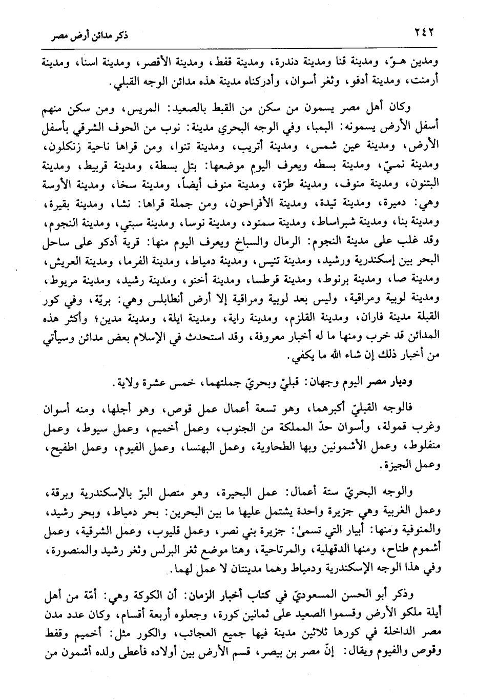 وكان أهل مصر يسمون من سكن من القبط بالصعيد: المريس، ومن سكن منهم أسفل الأرض يسمونه: البمبا، وفي الوجه البحري مدينة: نوب من الحوف الشرقي بأسفل الأرض، ومدينة عين شمس، ومدينة أتريب، ومدينة تنوا، ومن قراها ناحية زنكلون، ومدينة نميّ، ومدينة بسطه ويعرف اليوم موضعها: بتل بسطة، ومدينة قربيط، ومدينة البتنون، ومدينة منوف، ومدينة طرّة، ومدينة منوف أيضا، ومدينة سخا، ومدينة الأوسة وهي: دميرة، ومدينة تيدة، ومدينة الأفراحون، ومن جملة قراها: نشا، ومدينة بقيرة، ومدينة بنا، ومدينة شبراساط، ومدينة سمنود، ومدينة نوسا، ومدينة سبتي، ومدينة النجوم، وقد غلب على مدينة النجوم: الرمال والسباخ ويعرف اليوم منها: قرية أدكو على ساحل البحر بين إسكندرية ورشيد، ومدينة تنيس، ومدينة دمياط، ومدينة الفرما، ومدينة العريش، ومدينة صا، ومدينة برنوط، ومدينة قرطسا، ومدينة أخنو، ومدينة رشيد، ومدينة مريوط، ومدينة لوبية ومراقية، وليس بعد لوبية ومراقية إلا أرض أنطابلس وهي: بريّة، وفي كور القبلة مدينة فاران، ومدينة القلزم، ومدينة راية، ومدينة ايلة، ومدينة مدين؛ وأكثر هذه المدائن قد خرب ومنها ما له أخبار معروفة، وقد استحدث في الإسلام بعض مدائن وسيأتي من أخبار ذلك إن شاء الله ما يكفي.