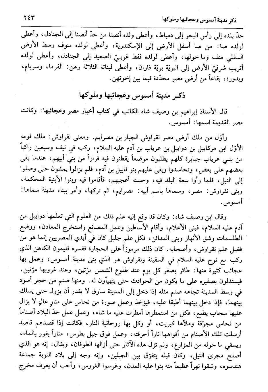 وقال ابن وصيف شاه: وكان قد وقع إليه علم ذلك من العلوم التي تعلمها دواييل من آدم عليه السلام، فبنى الأعلام، وأقام الأساطين وعمل المصانع واستخرج المعادن، ووضع الطلسمات وشق الأنهار وبنى المدائن، فكل علم جليل كان في أيدي المصريين إنما هو من فضل علم نقراوش، وأصحابه. كان ذلك مرموزا على الحجارة ففسره قليمون الكاهن الذي ركب مع نوح عليه السلام في السفينة ونقراوش هو الذي بنى مدينة أمسوس، وعمل بها عجائب كثيرة منها: طائر يصفر كل يوم عند طلوع الشمس مرّتين، وعند غروبها مرّتين، فيستدلون بصفيره على ما يكون من الحوادث حتى يتهيأون له. ومنها صنم من حجر أسود في وسط المدينة تجاهه صنم مثله إذا دخل إلى المدينة سارق لا يقدر أن يزول حتى يسلك بينهما، فإذا دخل بينهما أطبقا عليه، فيؤخذ وعمل صورة من نحاس على منار عال لا يزال عليها سحاب يطلع، فكل من استمطرها أمطرت عليه ما شاء، وعمل عمل حدّ البلاد أصناما من نحاس مجوّفة وملأها كبريت، أو وكل بها روحانية النار، فكانت إذا قصدهم قاصد أرسلت تلك الأصنام من أفواهها نارا أحرقته، وعمل فوق جبل بطرس، منارا يفور بالماء، ويسقي ما حوله من المزارع، ولم تزل هذه الآثار حتى أزالها الطوفان، ويقال: إنه هو الذي أصلح مجرى النيل، وكان قبله يتفرّق بين الجبلين، وإنه وجه إلى بلاد النوبة جماعة هندسوه، وشقوا نهرا عظيما منه بنوا عليه المدن، وغرسوا الغروس، وأحب أن يعرف مخرج