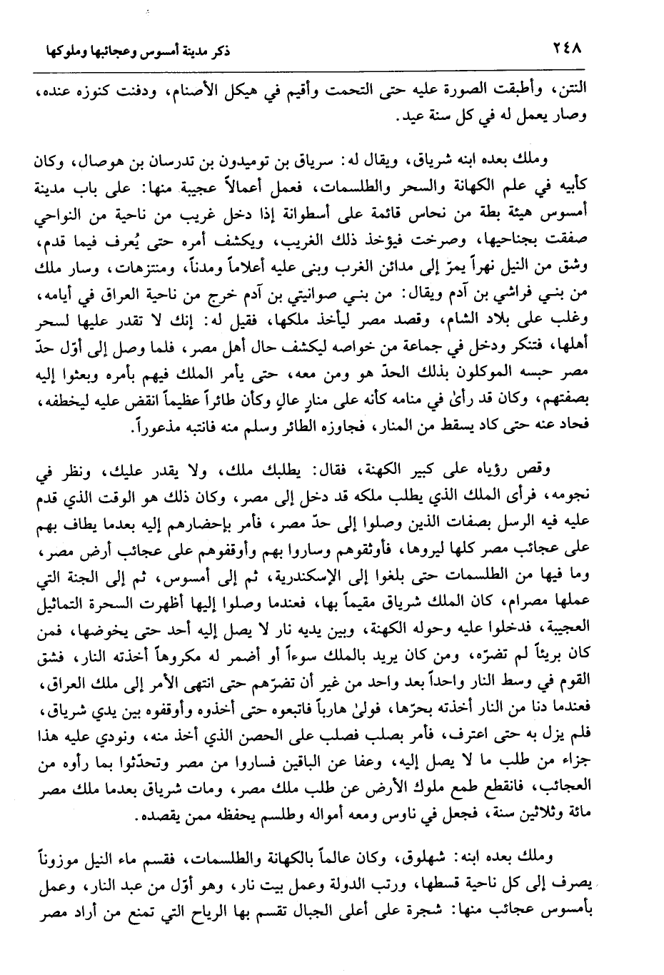 وقص رؤياه على كبير الكهنة، فقال: يطلبك ملك، ولا يقدر عليك، ونظر في نجومه، فرأى الملك الذي يطلب ملكه قد دخل إلى مصر، وكان ذلك هو الوقت الذي قدم عليه فيه الرسل بصفات الذين وصلوا إلى حدّ مصر، فأمر بإحضارهم إليه بعد ما يطاف بهم على عجائب مصر كلها ليروها، فأوثقوهم وساروا بهم وأوقفوهم على عجائب أرض مصر، وما فيها من الطلسمات حتى بلغوا إلى الإسكندرية، ثم إلى أمسوس، ثم إلى الجنة التي عملها مصرام، كان الملك شرياق مقيما بها، فعند ما وصلوا إليها أظهرت السحرة التماثيل العجيبة، فدخلوا عليه وحوله الكهنة، وبين يديه نار لا يصل إليه أحد حتى يخوضها، فمن كان بريئا لم تضرّه، ومن كان يريد بالملك سوءا أو أضمر له مكروها أخذته النار، فشق القوم في وسط النار واحدا بعد واحد من غير أن تضرّهم حتى انتهى الأمر إلى ملك العراق، فعندما دنا من النار أخذته بحرّها، فولى هاربا فاتبعوه حتى أخذوه وأوقفوه بين يدي شرياق، فلم يزل به حتى اعترف، فأمر بصلب فصلب على الحصن الذي أخذ منه، ونودي عليه هذا جزاء من طلب ما لا يصل إليه، وعفا عن الباقين فساروا من مصر وتحدّثوا بما رأوه من العجائب، فانقطع طمع ملوك الأرض عن طلب ملك مصر، ومات شرياق بعد ما ملك مصر مائة وثلاثين سنة، فجعل في ناوس ومعه أمواله وطلسم يحفظه ممن يقصده.