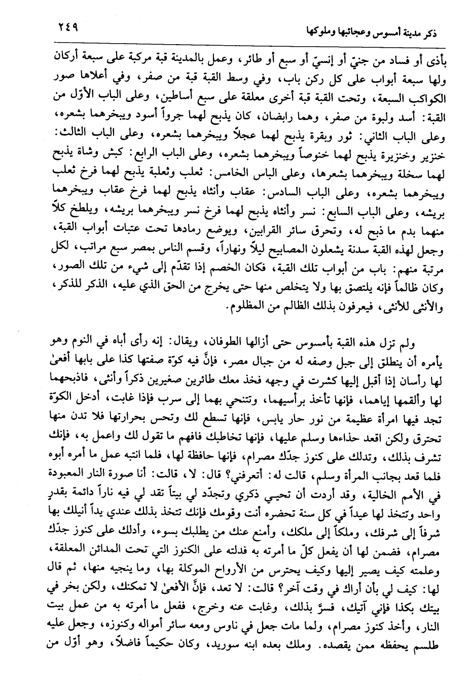 ولم تزل هذه القبة بأمسوس حتى أزالها الطوفان، ويقال: إنه رأى أباه في النوم وهو يأمره أن ينطلق إلى جبل وصفه له من جبال مصر، فإنّ فيه كوّة صفتها كذا على بابها أفعى لها رأسان إذا أقبل إليها كشرت في وجهه فخذ معك طائرين صغيرين ذكرا وأنثى، فاذبحهما لها وألقمها إياهما، فإنها تأخذ برأسيهما، وتتنحي بهما إلى سرب فإذا غابت، أدخل الكوّة تجد فيها امرأة عظيمة من نور حار يابس، فإنها تسطع لك وتحس بحرارتها فلا تدن منها تحترق ولكن اقعد حذاءها وسلم عليها، فإنها تخاطبك فافهم ما تقول لك واعمل به، فإنك تشرف بذلك، وتدلك على كنوز جدّك مصرام، فإنها حافظة لها، فلما انتبه عمل ما أمره أبوه فلما قعد بجانب المرأة وسلم، قالت له: أتعرفني؟ قال: لا، قالت: أنا صورة النار المعبودة في الأمم الخالية، وقد أردت أن تحيي ذكري وتجدّد لي بيتا تقد لي فيه نارا دائمة بقدر واحد وتتخذ لها عيدا في كل سنة تحضره أنت وقومك فإنك تتخذ بذلك عندي يدا أنيلك بها شرفا إلى شرفك، وملكا إلى ملكك، وأمنع عنك من يطلبك بسوء، وأدلك على كنوز جدّك مصرام، فضمن لها أن يفعل كلّ ما أمرته به فدلته على الكنوز التي تحت المدائن المعلقة، وعلمته كيف يصير إليها وكيف يحترس من الأرواح الموكلة بها، وما ينجيه منها، ثم قال لها: كيف لي بأن أراك في وقت آخر؟ قالت: لا تعد، فإنّ الأفعى لا تمكنك، ولكن بخر في بيتك بكذا فإني آتيك، فسرّ بذلك، وغابت عنه وخرج، ففعل ما أمرته به من عمل بيت النار، وأخذ كنوز مصرام، ولما مات جعل في ناوس ومعه سائر أمواله وكنوزه، وجعل عليه طلسم يحفظه ممن يقصده. وملك بعده ابنه سوريد، وكان حكيما فاضلا، وهو أوّل من