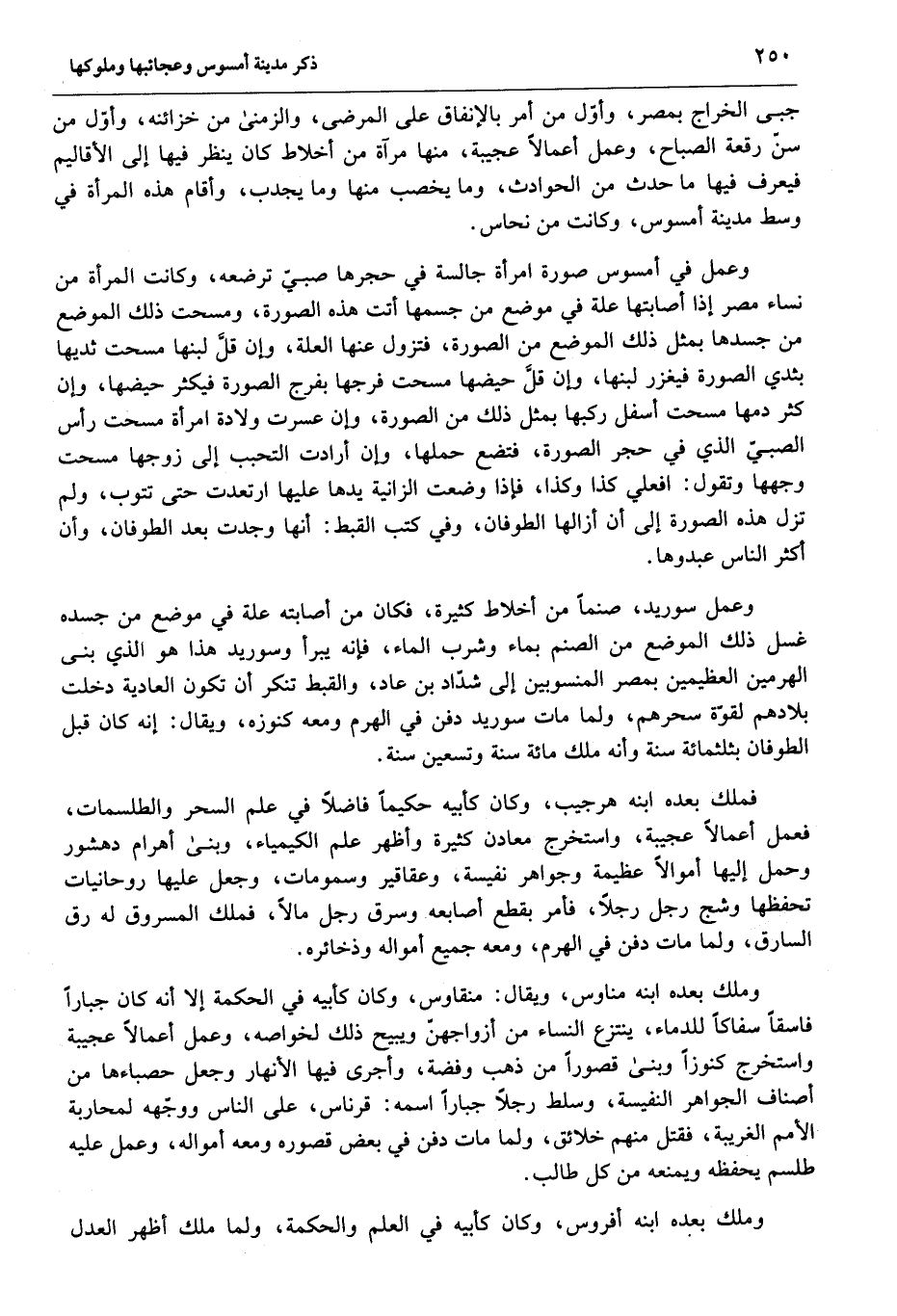 وعمل في أمسوس صورة امرأة جالسة في حجرها صبيّ ترضعه، وكانت المرأة من نساء مصر إذا أصابتها علة في موضع من جسمها أتت هذه الصورة، ومسحت ذلك الموضع من جسدها بمثل ذلك الموضع من الصورة، فتزول عنها العلة، وإن قلّ لبنها مسحت ثديها بثدي الصورة فيغزر لبنها، وإن قلّ حيضها مسحت فرجها بفرج الصورة فيكثر حيضها، وإن كثر دمها مسحت أسفل ركبها بمثل ذلك من الصورة، وإن عسرت ولادة امرأة مسحت رأس الصبيّ الذي في حجر الصورة، فتضع حملها، وإن أرادت التحبب إلى زوجها مسحت وجهها وتقول: افعلي كذا وكذا، فإذا وضعت الزانية يدها عليها ارتعدت حتى تتوب، ولم تزل هذه الصورة إلى أن أزالها الطوفان، وفي كتب القبط: أنها وجدت بعد الطوفان، وأن أكثر الناس عبدوها.