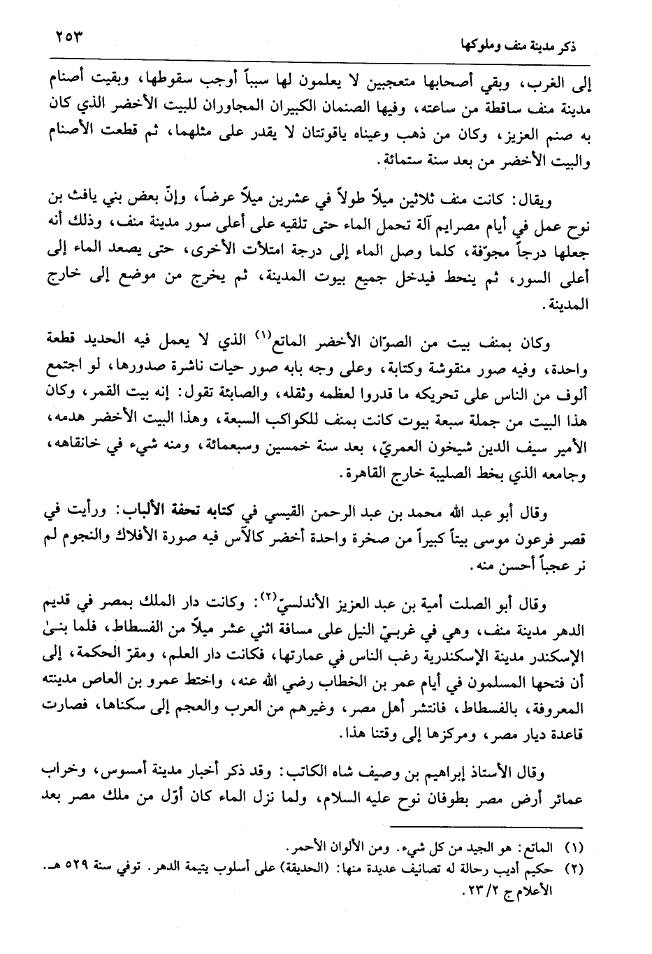إلى الغرب، وبقي أصحابها متعجبين لا يعلمون لها سببا أوجب سقوطها، وبقيت أصنام مدينة منف ساقطة من ساعته، وفيها الصنمان الكبيران المجاوران للبيت الأخضر الذي كان به صنم العزيز، وكان من ذهب وعيناه ياقوتتان لا يقدر على مثلهما، ثم قطعت الأصنام والبيت الأخضر من بعد سنة ستمائة.