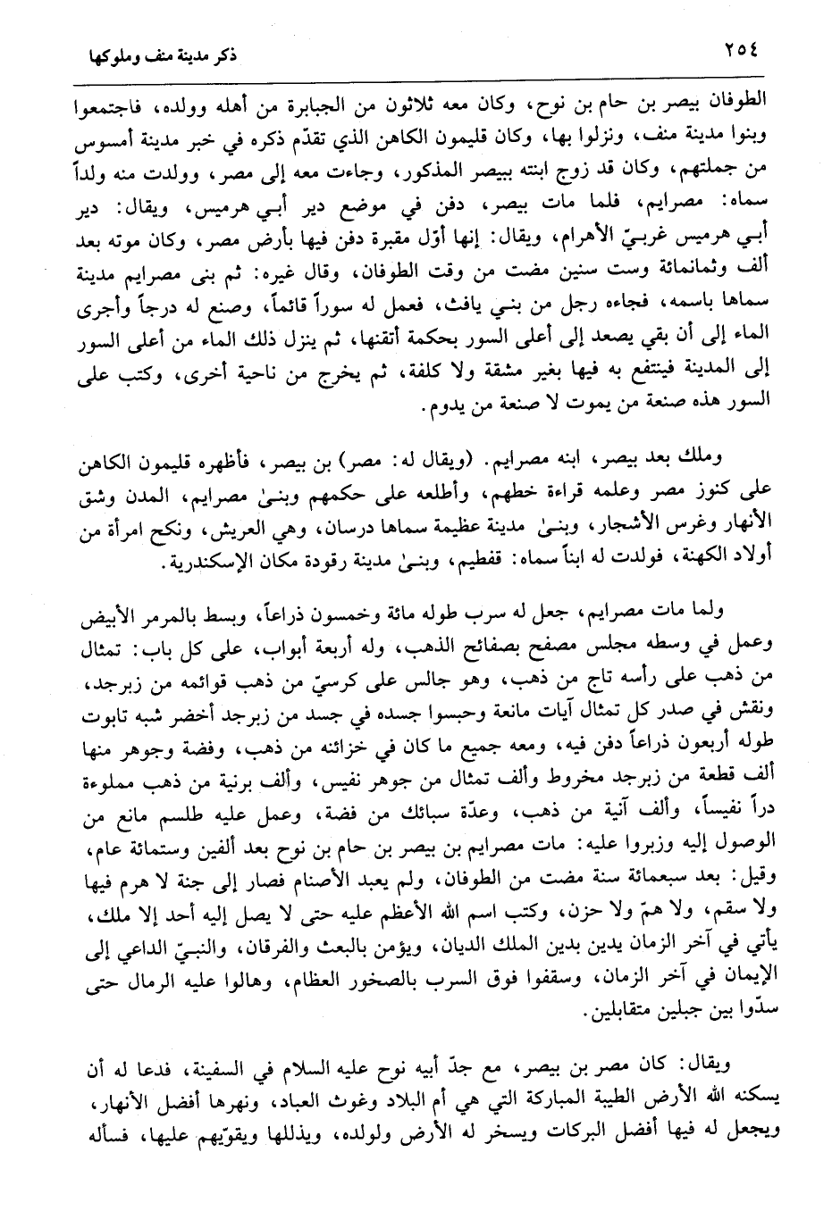 الطوفان بيصر بن حام بن نوح، وكان معه ثلاثون من الجبابرة من أهله وولده، فاجتمعوا وبنوا مدينة منف، ونزلوا بها، وكان قليمون الكاهن الذي تقدّم ذكره في خبر مدينة أمسوس من جملتهم، وكان قد زوج ابنته ببيصر المذكور، وجاءت معه إلى مصر، وولدت منه ولدا سماه: مصرايم، فلما مات بيصر، دفن في موضع دير أبي هرميس، ويقال: دير أبي هرميس غربيّ الأهرام، ويقال: إنها أوّل مقبرة دفن فيها بأرض مصر، وكان موته بعد ألف وثمانمائة وست سنين مضت من وقت الطوفان، وقال غيره: ثم بنى مصرايم مدينة سماها باسمه، فجاءه رجل من بني يافث، فعمل له سورا قائما، وصنع له درجا وأجرى الماء إلى أن بقي يصعد إلى أعلى السور بحكمة أتقنها، ثم ينزل ذلك الماء من أعلى السور إلى المدينة فينتفع به فيها بغير مشقة ولا كلفة، ثم يخرج من ناحية أخرى، وكتب على السور هذه صنعة من يموت لا صنعة من يدوم.