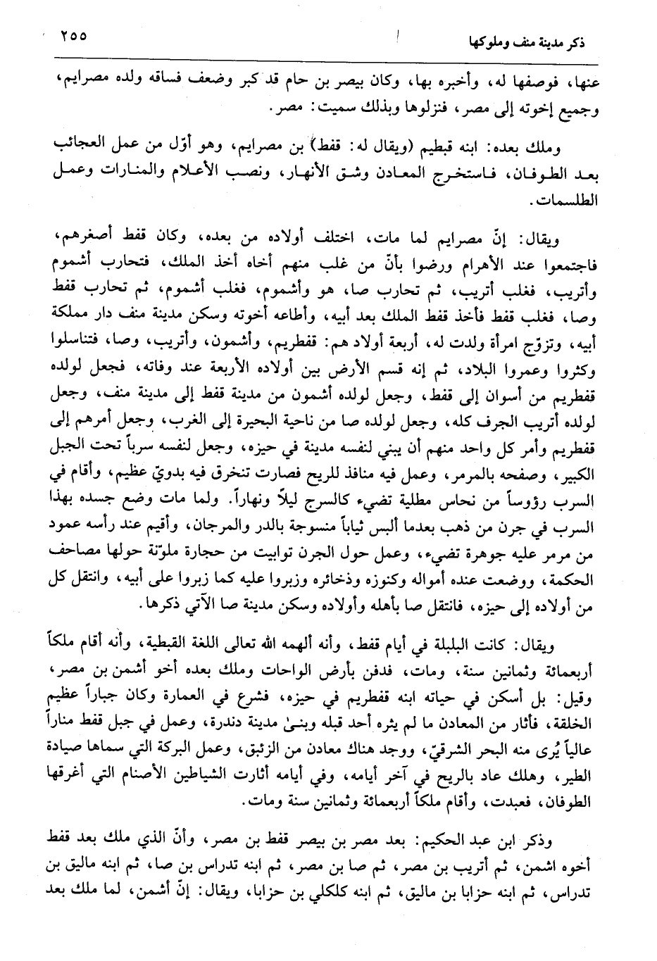 ويقال: كانت البلبلة في أيام قفط، وأنه ألهمه الله تعالى اللغة القبطية، وأنه أقام ملكا أربعمائة وثمانين سنة، ومات، فدفن بأرض الواحات وملك بعده أخو أشمن بن مصر، وقيل: بل أسكن في حياته ابنه قفطريم في حيزه، فشرع في العمارة وكان جبارا عظيم الخلقة، فأثار من المعادن ما لم يثره أحد قبله وبنى مدينة دندرة، وعمل في جبل قفط منارا عاليا يرى منه البحر الشرقيّ، ووجد هناك معادن من الزئبق، وعمل البركة التي سماها صيادة الطير، وهلك عاد بالريح في آخر أيامه، وفي أيامه أثارت الشياطين الأصنام التي أغرقها الطوفان، فعبدت، وأقام ملكا أربعمائة وثمانين سنة ومات.