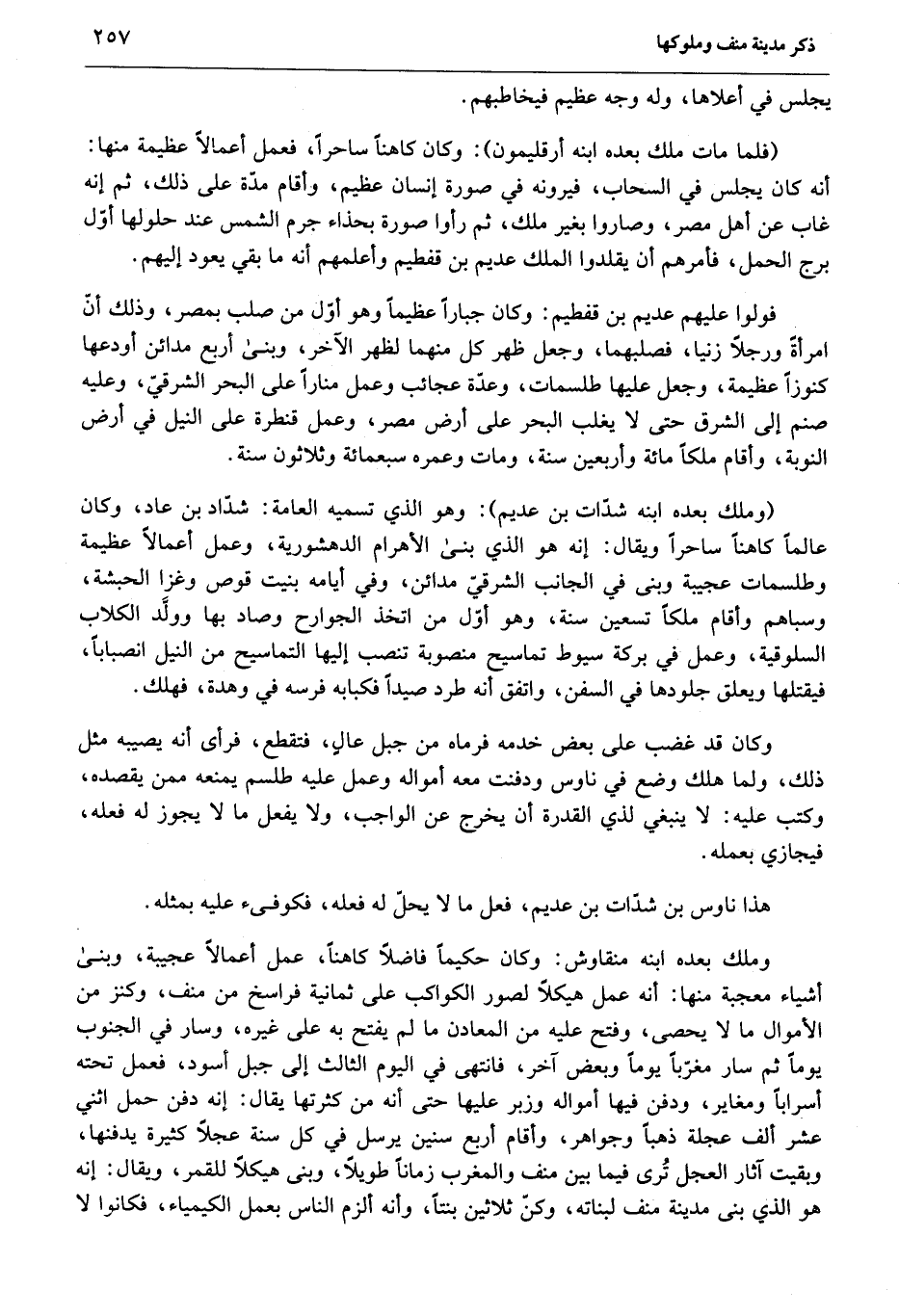 (وملك بعده ابنه شدّات بن عديم) : وهو الذي تسميه العامة: شدّاد بن عاد، وكان عالما كاهنا ساحرا ويقال: إنه هو الذي بنى الأهرام الدهشورية، وعمل أعمالا عظيمة وطلسمات عجيبة وبنى في الجانب الشرقيّ مدائن، وفي أيامه بنيت قوص وغزا الحبشة، وسباهم وأقام ملكا تسعين سنة، وهو أوّل من اتخذ الجوارح وصاد بها وولّد الكلاب السلوقية، وعمل في بركة سيوط تماسيح منصوبة تنصب إليها التماسيح من النيل انصبابا، فيقتلها ويعلق جلودها في السفن، واتفق أنه طرد صيدا فكبابه فرسه في وهدة، فهلك.