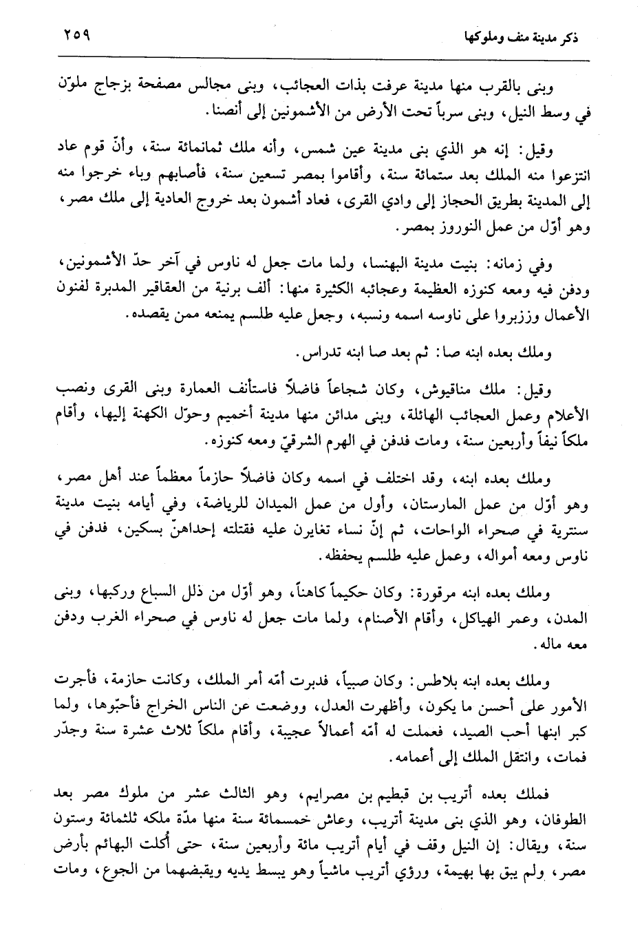 وقيل: ملك مناقيوش، وكان شجاعا فاضلا فاستأنف العمارة وبنى القرى ونصب الأعلام وعمل العجائب الهائلة، وبنى مدائن منها مدينة أخميم وحوّل الكهنة إليها، وأقام ملكا نيفا وأربعين سنة، ومات فدفن في الهرم الشرقيّ ومعه كنوزه.