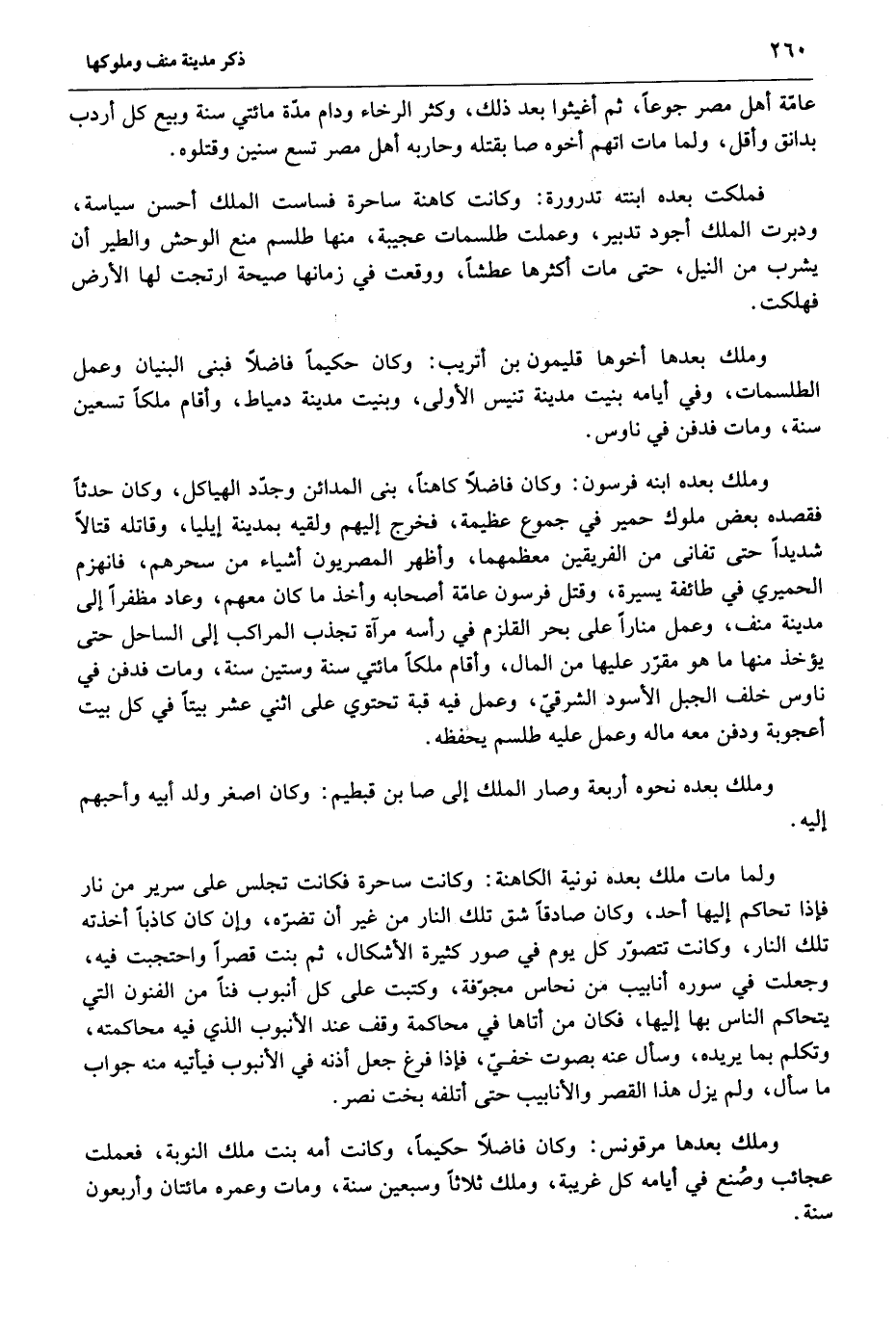 وملك بعدها مرقونس: وكان فاضلا حكيما، وكانت أمه بنت ملك النوبة، فعملت عجائب وصنع في أيامه كل غريبة، وملك ثلاثا وسبعين سنة، ومات وعمره مائتان وأربعون سنة.