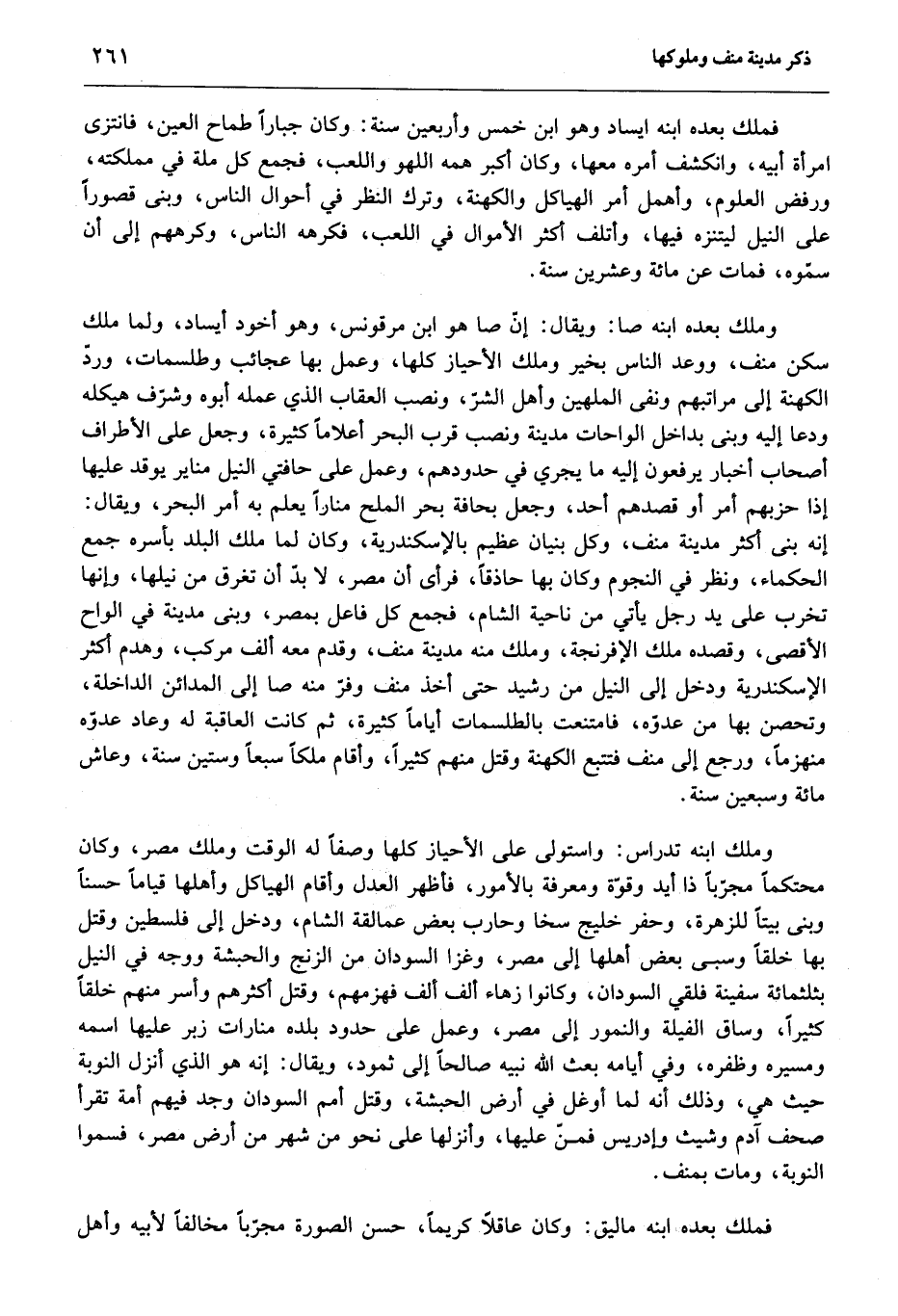 إنه بنى أكثر مدينة منف، وكل بنيان عظيم بالإسكندرية، وكان لما ملك البلد بأسره جمع الحكماء، ونظر في النجوم وكان بها حاذقا، فرأى أن مصر، لا بدّ أن تغرق من نيلها، وإنها تخرب على يد رجل يأتي من ناحية الشام، فجمع كل فاعل بمصر، وبنى مدينة في الواح الأقصى، وقصده ملك الإفرنجة، وملك منه مدينة منف، وقدم معه ألف مركب، وهدم أكثر الإسكندرية ودخل إلى النيل من رشيد حتى أخذ منف وفرّ منه صا إلى المدائن الداخلة، وتحصن بها من عدوّه، فامتنعت بالطلسمات أياما كثيرة، ثم كانت العاقبة له وعاد عدوّه منهزما، ورجع إلى منف فتتبع الكهنة وقتل منهم كثيرا، وأقام ملكا سبعا وستين سنة، وعاش مائة وسبعين سنة.