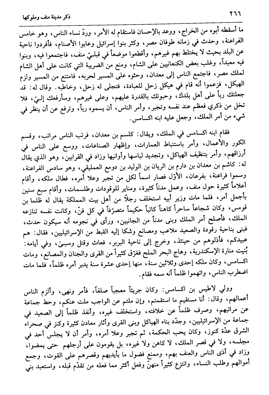 ما أسقطه أبوه من الخراج، ووعد بالإحسان فاستقام له الأمر، وردّ نساء الناس، وهو خامس الفراعنة، وحدث في زمانه طوفان مصر، وكثر بنوا إسرائيل وعابوا الأصنام، فأفردوا ناحية عن البلد بحيث لا يختلط بهم غيرهم، وأقطعوا موضعا في قبليّ منف، فاجتمعوا فيه، وبنوا فيه معبدا، وغلب بعض الكنعانيين على الشام، ومنع من الضريبة التي كانت على أهل الشام لملك مصر، فاجتمع الناس إلى معدان، وحثوه على المسير لحربه، فامتنع من المسير ولزم الهيكل، فزعموا أنه قام في هيكل زحل للعبادة، فتجلى له زحل، وخاطبه. وقال له: قد جعلتك ربا على أهل بلدك، وحبوتك بالقدرة عليهم، وعلى غيرهم، وسأرفعك إليّ، فلا تخل من ذكري فعظم عند نفسه وتجبر، وأمر الناس، أن يسموه ربا، وترفع عن أن ينظر في شيء من أمر الملك، وجعل عليه ابنه اكسامس.