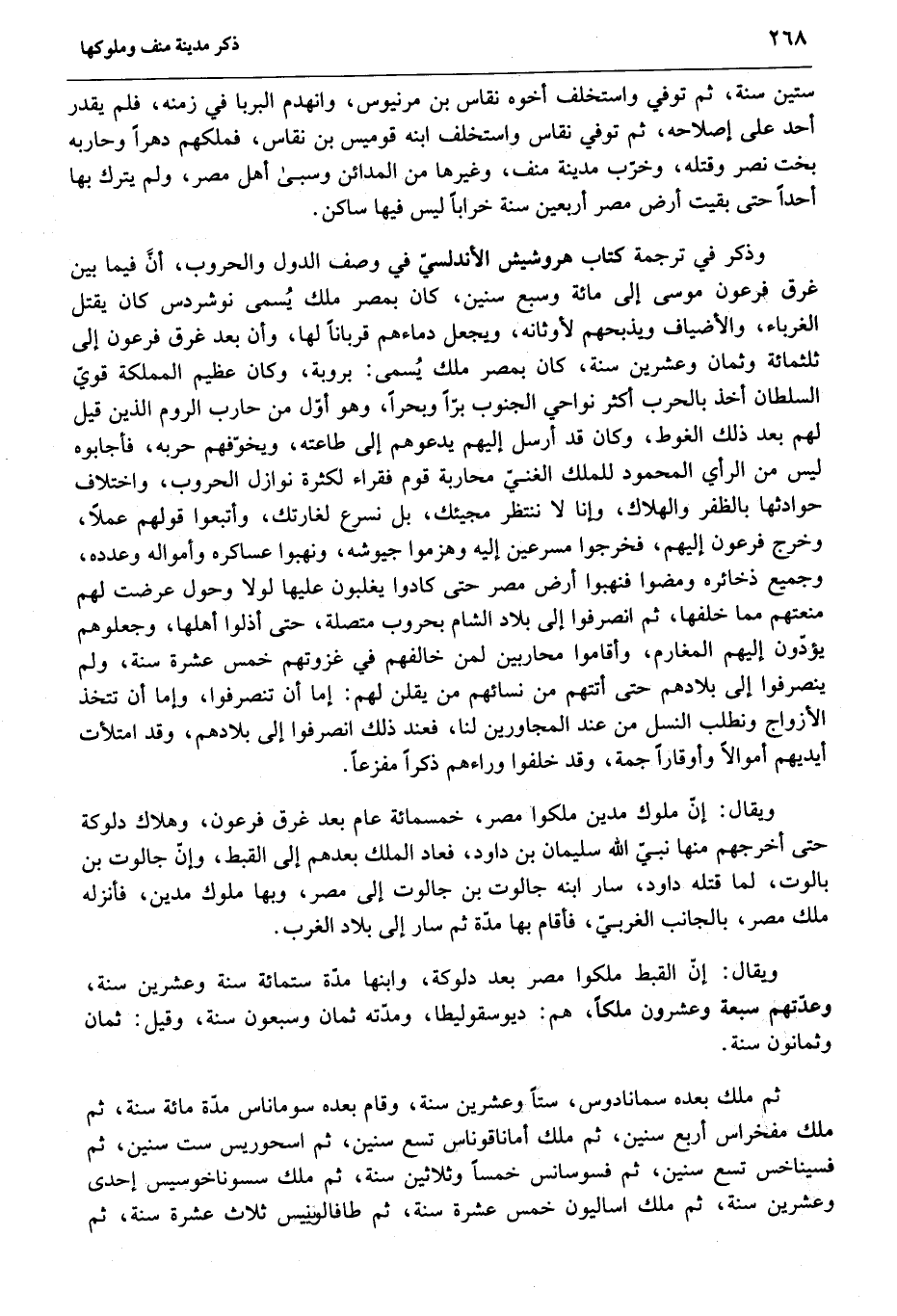 ستين سنة، ثم توفي واستخلف أخوه نقاس بن مرنيوس، وانهدم البربا في زمنه، فلم يقدر أحد على إصلاحه، ثم توفي نقاس واستخلف ابنه قوميس بن نقاس، فملكهم دهرا وحاربه بخت نصر وقتله، وخرّب مدينة منف، وغيرها من المدائن وسبى أهل مصر، ولم يترك بها أحدا حتى بقيت أرض مصر أربعين سنة خرابا ليس فيها ساكن.
