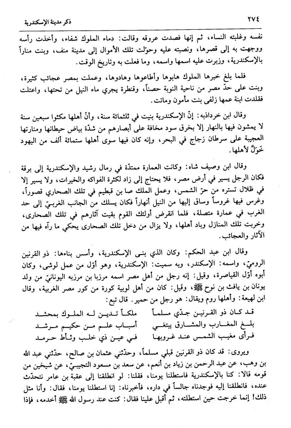 وقال ابن خرداذبه: إنّ الإسكندرية بنيت في ثلثمائة سنة، وأنّ أهلها مكثوا سبعين سنة لا يمشون فيها بالنهار إلا بخرق سود مخافة على أبصارهم من شدّة بياض حيطانها ومنارتها العجيبة على سرطان زجاج في البحر، وإنه كان فيها سوى أهلها ستمائة ألف من اليهود خول لأهلها.