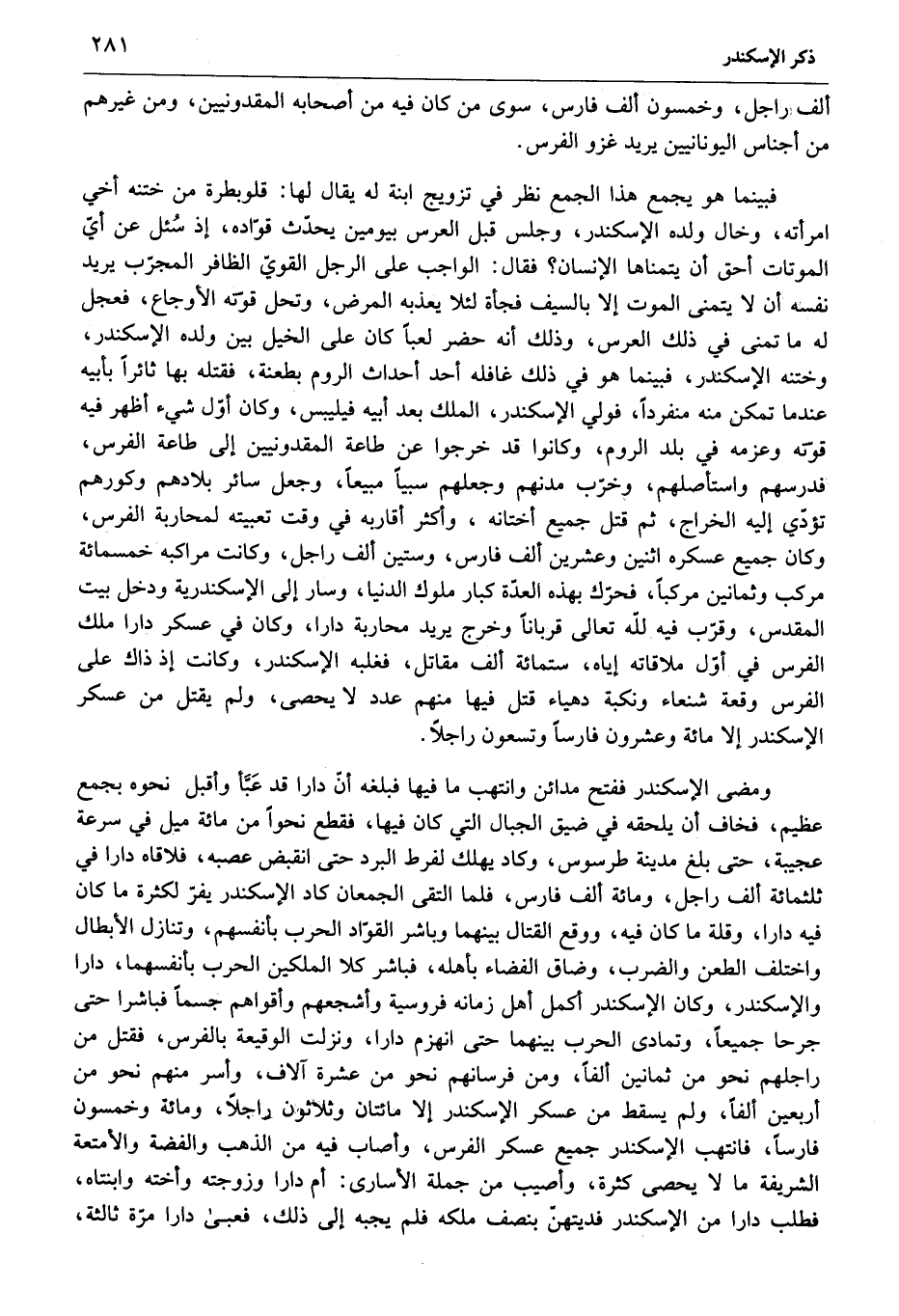 فبينما هو يجمع هذا الجمع نظر في تزويج ابنة له يقال لها: قلوبطرة من ختنه أخي امرأته، وخال ولده الإسكندر، وجلس قبل العرس بيومين يحدّث قوّاده، إذ سئل عن أيّ الموتات أحق أن يتمناها الإنسان؟ فقال: الواجب على الرجل القويّ الظافر المجرّب يريد نفسه أن لا يتمنى الموت إلا بالسيف فجأة لئلا يعذبه المرض، وتحل قوّته الأوجاع، فعجل له ما تمنى في ذلك العرس، وذلك أنه حضر لعبا كان على الخيل بين ولده الإسكندر، وختنه الإسكندر، فبينما هو في ذلك غافله أحد أحداث الروم بطعنة، فقتله بها ثائرا بأبيه عندما تمكن منه منفردا، فولي الإسكندر، الملك بعد أبيه فيليبس، وكان أوّل شيء أظهر فيه قوّته وعزمه في بلد الروم، وكانوا قد خرجوا عن طاعة المقدونيين إلى طاعة الفرس، فدرسهم واستأصلهم، وخرّب مدنهم وجعلهم سبيا مبيعا، وجعل سائر بلادهم وكورهم تؤدّي إليه الخراج، ثم قتل جميع أختانه، وأكثر أقاربه في وقت تعبيته لمحاربة الفرس، وكان جميع عسكره اثنين وعشرين ألف فارس، وستين ألف راجل، وكانت مراكبه خمسمائة مركب وثمانين مركبا، فحرّك بهذه العدّة كبار ملوك الدنيا، وسار إلى الإسكندرية ودخل بيت المقدس، وقرّب فيه لله تعالى قربانا وخرج يريد محاربة دارا، وكان في عسكر دارا ملك الفرس في أوّل ملاقاته إياه، ستمائة ألف مقاتل، فغلبه الإسكندر، وكانت إذ ذاك على الفرس وقعة شنعاء ونكبة دهياء قتل فيها منهم عدد لا يحصى، ولم يقتل من عسكر الإسكندر إلا مائة وعشرون فارسا وتسعون راجلا.